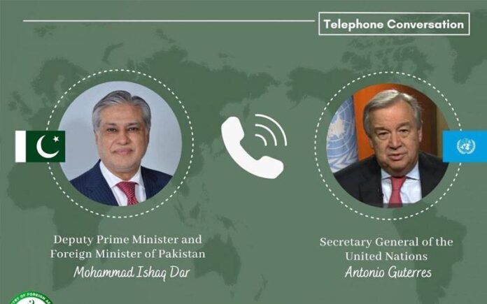 HomePoliticsاسحاق ڈار کا سیکرٹری جنرل اقوام متحدہ سے ٹیلی فونک رابطہ، پاکستان... Politics اسحاق ڈار کا سیکرٹری جنرل اقوام متحدہ سے ٹیلی فونک رابطہ، پاکستان کی سفارتی کوششوں پر تبادلہ خیال By muhammadhasan0426@gmail.com April 28, 2026 0 2 Share FacebookTwitterPinterestWhatsApp (انورعباس)نائب وزیراعظم و وزیرِ خارجہ اسحاق ڈار کا اقوام متحدہ کے سیکرٹری جنرل انتونیو گوتریس سے ٹیلیفونک رابطہ ہوا ہے۔ Read full story on 24 News Digital Urdu Share FacebookTwitterPinterestWhatsApp Previous articlePakistan Envoy Umar Farooq Zahoor Files Defamation Case Against Norwegian TabloidNext articleStephen Colbert reflects on ‘Late Show’ cancellation RELATED ARTICLES Politics آزاد جموں و کشمیر میں جاب فیسٹیول کا آغاز، نوجوانوں کے لیے روزگار کے مواقع فراہم April 28, 2026 Politics ‘Outspoken’ trio of IHC judges transferred April 28, 2026 Politics Gulf dynamics shift as UAE exits OPEC April 28, 2026 LEAVE A REPLY Cancel reply Comment: Please enter your comment! Name:* Please enter your name here Email:* You have entered an incorrect email address! Please enter your email address here Website: Save my name, email, and website in this browser for the next time I comment. - Advertisment - Most Popular Islamabad, Pakistan Weather: More rain, gusty winds expected April 28, 2026 Afghanistan | Floods situation – DG ECHO Daily Map | 28/04/2026 April 28, 2026 Ariana Grande announces new album ‘Petal’ dropping July April 28, 2026 Mahira Khan shares amusing story of her interaction with ChatGPT April 28, 2026 Load more Recent Comments