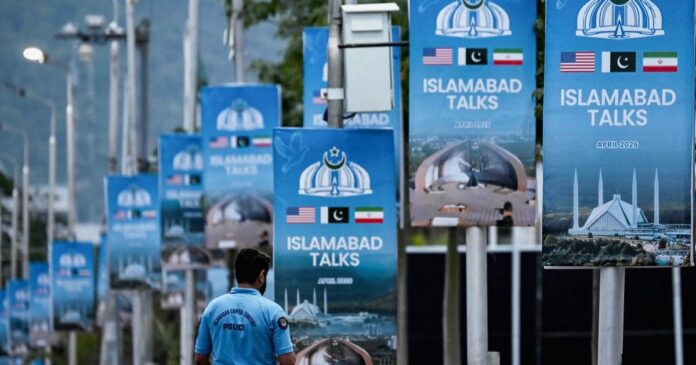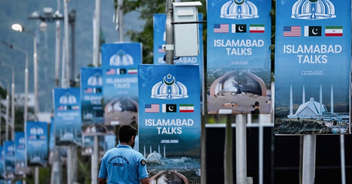 18 اپریل 2026 کو اسلام آباد میں ایران امریکہ مذاکرات کی تیاریوں کے سلسلے میں بینر اور سائن بورڈ (اے ایف پی)