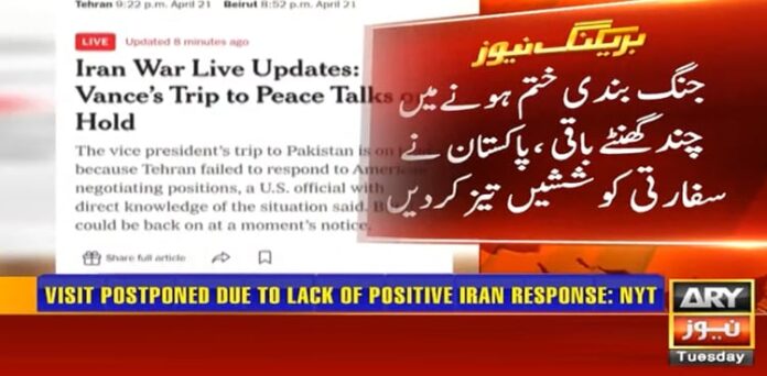 اسلام آباد (21 اپریل 2026): امریکا اور ایران کے درمیان عارضی جنگ بندی ختم ہونے میں چند گھنٹے باقی ہیں اور پاکستان نے امن کیلیے سفارتی کوششیں تیز کر دیں۔ امریکا کی آبنائے ہرمز پر ناکہ بندی اور ایران کا دوسرا بحری جہاز پکڑنے پر تہران ناراض ہے۔ ایران کا کہنا ہے کہ بحری ناکہ