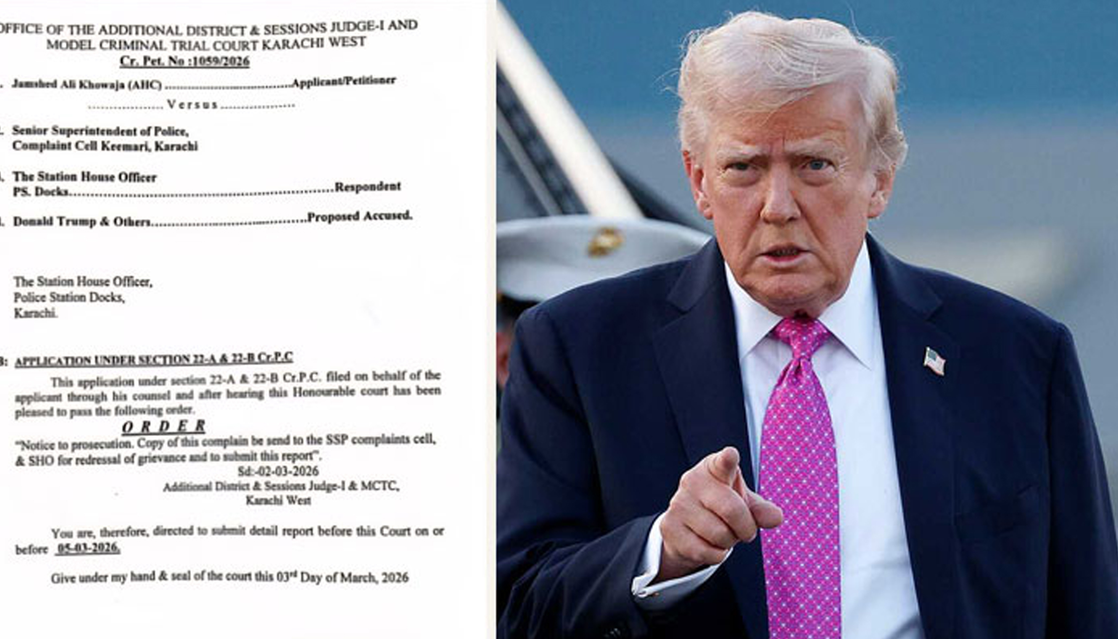 کراچی (قدرت روزنامہ)امریکی صدر ڈونلڈ ٹرمپ اور دیگر کے خلاف کراچی کی ضلعی عدالت میں مقامی وکیل کی جانب سے درخواست دائر کی گئی ہے۔ سوشل میڈیا پر وائرل پٹیشن نمبر 1095/26 ایڈیشنل ڈسٹرکٹ اینڈ سیشن جج و ماڈل کرمنل ٹرائل کورٹ ویسٹ 1 میں دائر ظاہر کی گئی ہے۔ ڈونلڈ ٹرمپ کے خلاف پٹیشن …