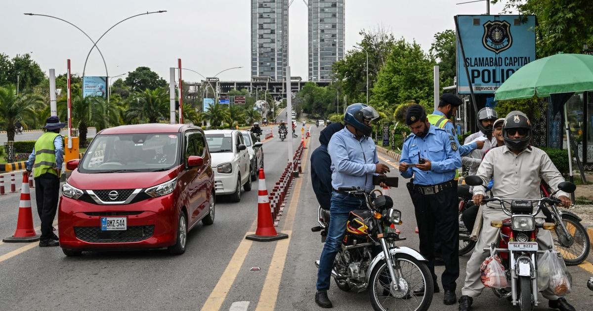 18 اپریل 2026 کو اسلام آباد کے ریڈ زون علاقے میں سکیورٹی چیک پوسٹ پر پولیس اہلکار گاڑیوں کی تلاشی لے رہے ہیں (اے ایف پی)
