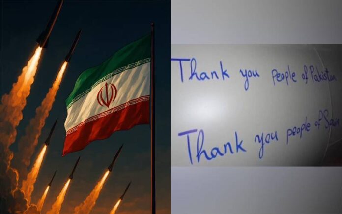 HomeLifestyleایران نے اسرائیل پرداغے جانے والے میزائلوں پر تھینک یو پیپلز آف... Lifestyle ایران نے اسرائیل پرداغے جانے والے میزائلوں پر تھینک یو پیپلز آف پاکستان لکھ دیا By muhammadhasan0426@gmail.com March 27, 2026 0 2 Share FacebookTwitterPinterestWhatsApp (ویب ڈیسک )ایرانی پاسداران انقلاب نے انوکھے انداز میں پاکستان کا شکریہ ادا کیا۔ Read full story on 24 News Digital Urdu Share FacebookTwitterPinterestWhatsApp Previous articleمقبوضہ جموں و کشمیر میں امتیازی سلوک اور مذہبی پابندیاںNext articleکفایت شعاری مہم میں اکثر سینیٹرز نے تنخواہوں میں کٹوتی کی مخالفت کردی RELATED ARTICLES Lifestyle توانائی بحران کے دوران کم آمدن والے افراد کو پیٹرول سبسڈی کی تیاری شروع March 27, 2026 Lifestyle مقبوضہ جموں و کشمیر میں امتیازی سلوک اور مذہبی پابندیاں March 27, 2026 Lifestyle پنجاب میں کل ‘ارتھ آور’ منانے کا اعلان: وزیراعلیٰ مریم نواز کی عوام سے روشنیاں گل کرنے کی اپیل March 27, 2026 LEAVE A REPLY Cancel reply Comment: Please enter your comment! Name:* Please enter your name here Email:* You have entered an incorrect email address! Please enter your email address here Website: Save my name, email, and website in this browser for the next time I comment. - Advertisment - Most Popular Jujutsu Kaisen The Culling Game moves into Season 4 following major announcement March 27, 2026 Yashma Gill slays in soft blue ensemble March 27, 2026 Taylor Swift’s emotional win hits different this time: ‘Love what you do’ March 27, 2026 Charlie Puth takes first-ever chance to be ‘incredibly honest’ in his new music March 27, 2026 Load more Recent Comments
