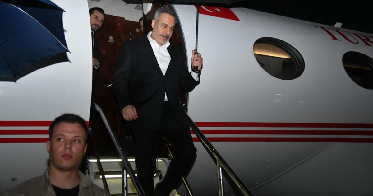 28 مارچ، 2026 کی اس تصویر میں ترکی کے وزیر خارجہ حاقان فیدان کو پاکستان پہنچنے کے بعد طیارے سے باہر آ رہے ہیں (دفتر خارجہ پاکستان)