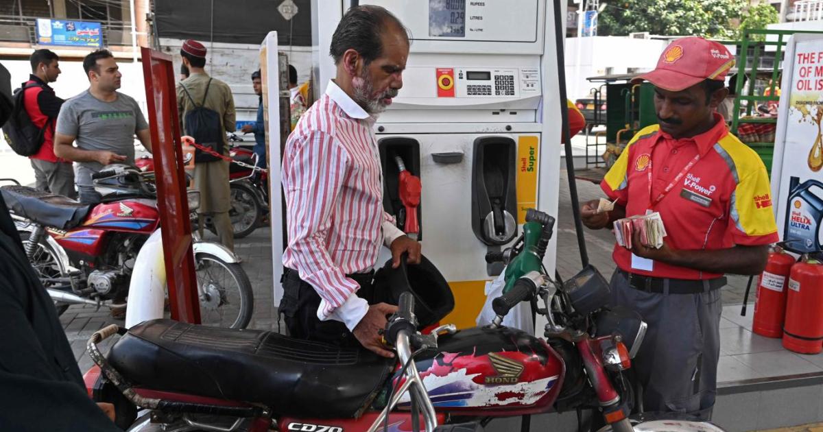 لاہور میں ایک موٹرسائیکل سوار یکم اگست، 2023 کو قیمتوں میں اضافے کے بعد پیٹرول بھرواتے ہوئے (اے ایف پی)