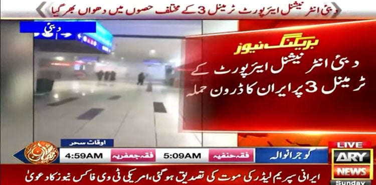 دبئی انٹرنیشنل ایئرپورٹ کے ٹرمینل 3 پر ایران کی جانب سے ڈرون حملہ کیا گیا ہے، ٹرمینل کے مختلف حصوں میں دھواں بھر گیا۔ اے آر وائی نیوز کے مطابق دبئی انٹرنیشنل ایئرپورٹ ٹرمینل 3 کے مختلف حصوں میں دھواں بھر گیا ہے، ٹرمینل 3 پر ایران نے ڈرون حملہ کیا ہے جس کے بعد […]