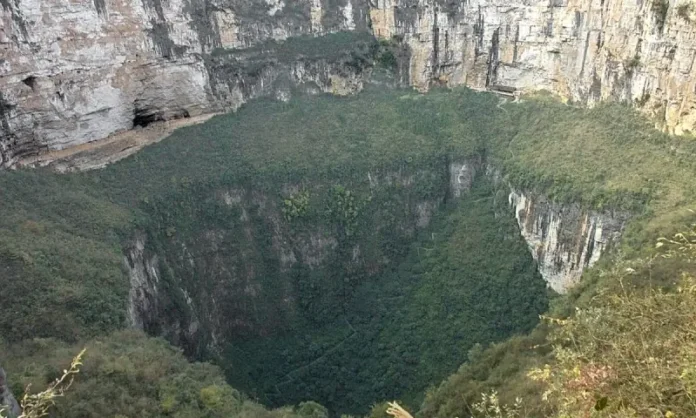 چین کے چونگ چنگ میونسپلٹی میں واقع ایک دیوہیکل سنک ہول، جسے مقامی طور پر شیاؤزہائی تیان کنگ یا آسمانی گڑھا کہا جاتا ہے، اپنے غیر معمولی سائز، پیچیدہ تشکیل اور منفرد ماحولیاتی نظام کے باعث دنیا بھر میں توجہ کا مرکز بن گیا ہے۔ چین کے علاقے چونگ چنگ میں موجود یہ وسیع و عریض سنک ہول صدیوں سے مقامی افراد کے علم میں ہے۔ شیاؤزہائی دراصل ایک متروک گاؤں کا نام ہے، جبکہ تیان کنگ سنک ہول کے لیے استعمال ہونے والی مقامی اصطلاح ہے۔ یہ غیر معمولی قدرتی کھائی اپنے سائز کے اعتبار سے دنیا کے بڑے سنک ہولز میں شمار ہوتی ہے۔ اس کی گہرائی 626 میٹر اور چوڑائی 527 میٹر ہے، جس کے باعث یہ ایفل ٹاور سے تقریباً دو گنا لمبا اور لندن کے او ٹو ایرینا سے ڈیڑھ گنا زیادہ چوڑا ہے۔ اس سنک ہول کا مجموعی حجم تقریباً 120 ملین مکعب میٹر بتایا جاتا ہے، جس میں 40 ہزار اولمپک سائز سوئمنگ پولز یا تقریباً 500 ہنڈنبرگ کلاس زیپلنز سما سکتے ہیں۔ ماہرین کے مطابق سنک ہولز زمین کی سطح پر بننے والے گہرے گڑھے ہوتے ہیں، جو اس وقت وجود میں آتے ہیں جب اوپری سطح نیچے موجود کھوکھلے حصوں میں دھنس جاتی ہے۔ یہ عمل بتدریج بھی ہو سکتا ہے اور اچانک بھی، جبکہ اس کی وجوہات میں شدید بارشیں، سیلاب اور انسانی سرگرمیاں جیسے تعمیرات اور کان کنی شامل ہیں۔ رپورٹس کے مطابق اس گڑھے کی تشکیل ایک پیچیدہ قدرتی عمل کا نتیجہ ہے، جس میں زمین کے اوپر اور نیچے دونوں جانب کی قوتیں شامل رہیں۔ ہزاروں برسوں تک بارش کا پانی علاقے کی مسام دار چونا پتھر کی تہوں میں جذب ہوتا رہا، جس سے دراڑیں بڑھتی گئیں اور کٹاؤ میں اضافہ ہوتا گیا۔ اسی دوران زیرِ زمین ایک طاقتور دریا غاروں اور سرنگوں کا جال بناتا رہا، یہاں تک کہ کسی مرحلے پر زمین کی سطح بیٹھ گئی اور یہ وسیع سنک ہول وجود میں آ گیا۔ ماہرین کا کہنا ہے کہ یہ عمل ایک ہی وقت میں نہیں بلکہ مختلف مراحل میں مکمل ہوا۔ اس سنک ہول کی منفرد دوہری ساخت ہے، جس میں اوپر کا بڑا دہانہ عمودی چٹانوں سے گھرا ہوا ہے جبکہ نیچے جا کر یہ نسبتاً چھوٹے گڑھے میں تبدیل ہو جاتا ہے، جو اس کی دو مرحلوں میں تشکیل کی نشاندہی کرتا ہے۔ اگرچہ اس کے بننے کا درست وقت معلوم نہیں، تاہم وقت گزرنے کے ساتھ اس کے اندر ایک مکمل نیم استوائی ماحولیاتی نظام پروان چڑھ چکا ہے۔ یہاں کا ماحول ٹھنڈا اور مرطوب مائیکرو کلائمٹ رکھتا ہے، جو اسے منفرد بناتا ہے۔ اس سنک ہول میں نایاب چیتا بھی دیکھا گیا ہے جبکہ یہاں 1200 سے زائد اقسام کے پودے موجود ہیں، جن میں قدیم گنکگو درخت، فرنز اور کائی شامل ہیں۔ دلچسپ امر یہ ہے کہ کم روشنی کے باوجود یہاں کے پودوں نے اپنے ماحول سے ہم آہنگی پیدا کر لی ہے۔ 2024 میں چینی جرنل آف پلانٹ ایکولوجی میں شائع ہونے والی تحقیق کے مطابق یہاں کے پودوں میں کاربن کی مقدار نسبتاً کم جبکہ نائٹروجن اور فاسفورس جیسے عناصر کی مقدار زیادہ پائی گئی ہے، جو ان کی ماحولیاتی مطابقت کو ظاہر کرتی ہے۔