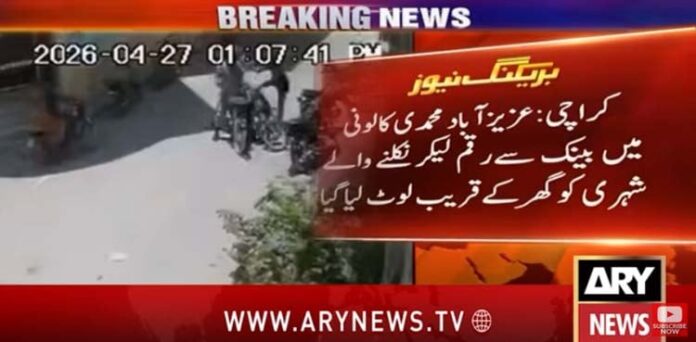 کراچی کے علاقے عزیز آباد میں شہری کو گھر کے قریب لوٹ لیا گیا جس کی ویڈیو سامنے آگئی۔ اے آر وائی نیوز کے مطابق کراچی کے علاقے عزیز آباد محمد کالونی میں موٹر سائیکل پر سوار دو مسلح ملزمان نے شہری کو گھر کے قریب لوٹا اور فرار ہوگئے۔ شہری آفتاب عالم بینک سے