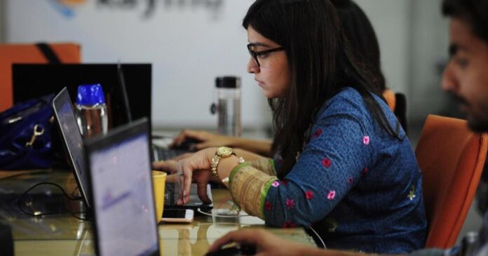 19 نومبر، 2015 کو کراچی میں ایک آن لائن کمپنی کے دفتر میں ملازمین کام کر رہے ہیں(اے ایف پی)