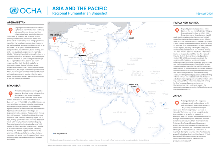 Country: Afghanistan Source: UN Office for the Coordination of Humanitarian Affairs Please refer to the attached file. AFGHANISTAN Ongoing cross-border hostilities between Afghanistan and Pakistan have continued, with casualties and damage to civilian infrastructure being reported, and access constrained by insecurity and explosive hazards. Shelling, armed clashes, anti-aircraft gunfire and drone activity have been reported during April. Civilian casualties that have been reported since the start of the conflict include women and children, as well as an aid worker. On 16 April, a woman was killed in Dangam district, Kunar Province, due to shelling, and on the previous day, three people were reportedly killed in Pakistan’s Khyber Pakhtunkhwa Province as a result of shelling from Afghanistan. A school in Kunar was also struck on 15 April, causing severe damage but no reported casualties. Despite last week’s reopening of the Nari–Kamdesh road after a two-month closure, UN road missions remain suspended and most border crossings remain closed. More than 94, 000 people have been displaced across Khost, Kunar, Nangarhar, Paktia, Paktika and Nuristan, with needs assessments ongoing in hard-to-reach areas. Humanitarian partners are providing response in line with ongoing assessments. MYANMAR Armed hostilities continued through the Myanmar New Year period, with airstrikes, drone attacks and ground operations driving civilian casualties, displacement and the destruction of homes and infrastructure. Between 1 and 19 April 2026, at least 30 civilians were reportedly killed and dozens injured across Magway, Mandalay and Sagaing regions in northwestern Myanmar, as well as in Rakhine State. In northwestern Myanmar, violence affected both villages and displacement sites, including the destruction of more than 400 houses in Pakokku Township and temporary shelters in Pauk Township in Magway Region. On 19 April, military operations in Pauk Township displaced nearly 5, 000 people, while an airstrike in Sagaing Township, Sagaing Region, displaced around 1, 000 people. On 2 April, airstrikes hit a temporary hospital in Monywa Township, Sagaing Region, damaging buildings and medical supplies. In Rakhine State, airstrikes in Minbya and other townships displaced more than 200 people in the first week of April, many sheltering along riverbanks amid fears of renewed hostilities. PAPUA NEW GUINEA Tropical Cyclone Maila developed in the Solomon Sea and intensified into a Category 3 severe tropical cyclone on 6 April 2026. The system moved slowly between 6 and 7 April, significantly increasing the prolonged rainfall, coastal inundation, and strong winds across affected areas. It further intensified into a Category 5 cyclone on 8 April, causing widespread impacts in provinces along its path. Due to its slow movement, TC Maila generated severe impacts, including catastrophic wind gusts, intense and sustained rainfall, and structural damage. The most affected locations include the Autonomous Region of Bougainville and Milne Bay. The National Disaster Centre’s National Emergency Operations Centre (NDC-NEOC), continues to coordinate the government-led response operations in close collaboration with provincial authorities, security forces, and the Disaster Management Team (DMT). To date, assessments have identified that 13, 500 people have been affected, of whom more than 12, 000 are in need of humanitarian assistance. Bougainville has transitioned into stabilisation phase, with a focus on restoring access, resettling affected populations, and conducting detailed damage and needs assessments. Response activities remain ongoing across East New Britain, Milne Bay, Manus, and New Ireland provinces, with varying levels of access and assessment progress. Humanitarian partners continue to support the response through assessments, relief distributions, and cash‐based assistance. JAPAN A strong and shallow 7. 4-magnitude earthquake struck northern Japan on 20 April, with Japan’s Meteorological Agency (JMA) issuing a tsunami warning for waves up to 3m in Iwate prefecture and parts of Hokkaido. The tremor was strong enough to shake large buildings as far as Tokyo, hundreds of kilometres away. All tsunami advisories were lifted by midnight of the same day, with the highest recorded tsunami wave measuring 80 cm observed in Iwate Prefecture. The Fire and Disaster Management Agency reported three injuries in Iwate and Aomori prefectures. Meanwhile, the Cabinet Office issued an advisory for an increased risk of earthquakes of magnitude 8 or higher occurring in the Pacific coastal areas of Hokkaido and northern Honshu until 27 April. Residents of 182 cities and towns across seven prefectures were advised to take additional precautionary measures.