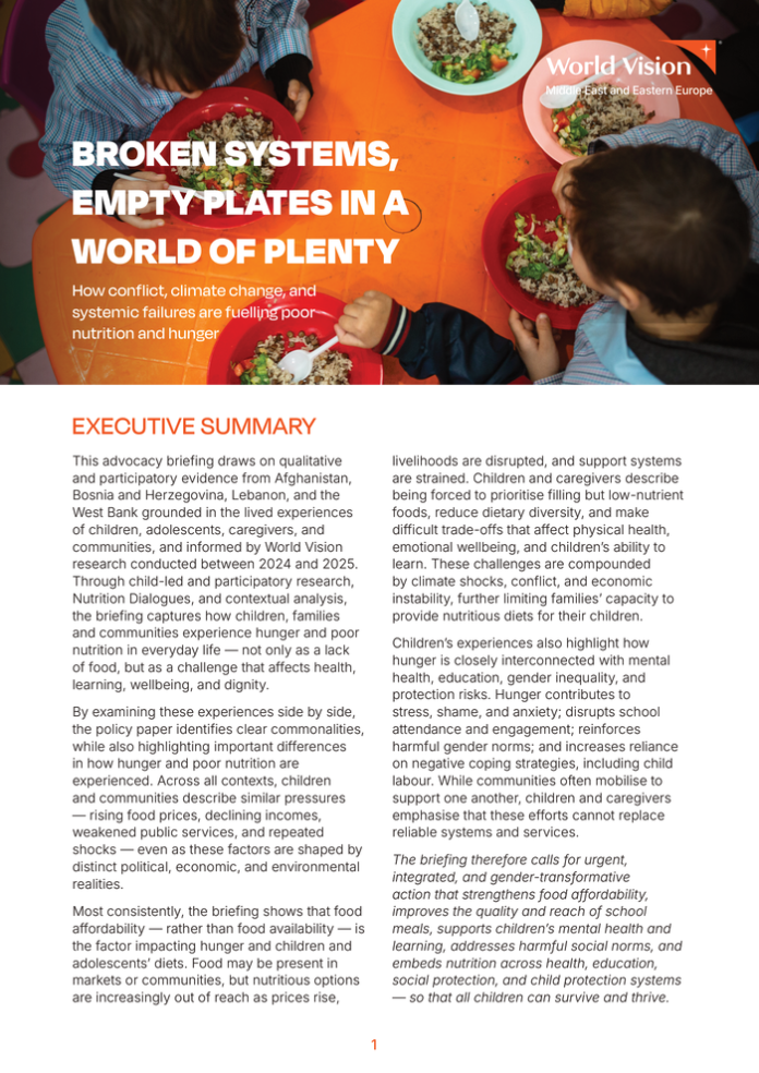 Countries: Afghanistan, Bosnia and Herzegovina, Lebanon, occupied Palestinian territory Source: World Vision Please refer to the attached file. Unaffordable food, not scarcity, driving child hunger across the Middle East and Eastern Europe, new World Vision brief finds 27 March 2026 – Hunger across parts of the Middle East and Eastern Europe is increasingly driven by economic exclusion and systemic failures rather than a lack of food availability, according to a new policy brief released by World Vision, drawing on evidence from Afghanistan, Bosnia and Herzegovina, Lebanon, and the West Bank. The policy brief highlights a consistent pattern across all four contexts: food remains available in markets but is becoming progressively unaffordable as households face declining incomes, rising prices, and weakened public systems. Key findings include: Food affordability is the primary driver of poor diets across the region, with households unable to consistently access nutritious food. Climate change and environmental degradation are acting as risk multipliers, worsening food insecurity and undermining nutrition outcomes. Nutrition knowledge gaps are reducing diet quality and limiting families’ ability to make healthy food choices. Schools are critical nutrition spaces that influence both learning and children’s wellbeing. Community mobilisation plays a critical buffering role in reducing the impacts of food insecurity and poor nutrition. “Children are not just eating less, they are eating worse. Caregivers consistently describe being forced to make daily trade-offs between food quantity and quality, often prioritising inexpensive, calorie-dense foods while reducing dietary diversity” said Eleanor Monbiot, Regional Leader at World Vision Middle East and Eastern Europe. “These are not short-term adjustments, they are eroding children’s health, affecting how they grow, how they learn, and how they cope each day. ” In Afghanistan, economic contraction and climate pressures have compelled families to sell nutrient-rich foods immediately after production to meet basic needs, undermining household consumption. In Bosnia and Herzegovina, persistent gaps in coordination across social sectors and rising living costs are limiting access to preventive nutrition support. In Lebanon, prolonged economic crisis and inflation have significantly eroded purchasing power, disrupting the relationship between employment and food access. In the West Bank, income loss and access restrictions have sharply reduced households’ ability to afford food, even where markets remain functional. World Vision evidence further underscores that hunger is not solely a nutritional issue, but one with significant psychosocial and developmental implications. Children across all contexts report heightened levels of stress, anxiety, and social exclusion linked to food insecurity, alongside reduced concentration, school absenteeism, and increased exposure to child labour. “Food insecurity is having multidimensional impacts on children, extending beyond physical health to affect mental wellbeing, educational engagement, and social inclusion, ” Monbiot said. “These effects are cumulative and, if unaddressed, risk undermining long-term human capital development. ” Climate change and environmental degradation are identified as key risk multipliers, exacerbating existing vulnerabilities by disrupting livelihoods, increasing food prices, and constraining access to water and productive resources. At the same time, structural inequalities, including gender norms, displacement, and poverty, continue to shape who is most affected, with women and girls disproportionately bearing the burden of food insecurity. The findings also highlight the critical role of schools as protective environments. Where school-based meal programmes and nutrition support are in place, they contribute to improved attendance, learning outcomes, and psychosocial wellbeing. However, provision remains uneven across contexts, limiting their potential as reliable safety nets. World Vision calls on governments, donors, UN agencies and partners to scale up predictable, shock-responsive cash and voucher assistance, expand nutritious school meal programmes, and strengthen social protection systems to prevent harmful coping strategies, including reduced dietary diversity. We also urge more integrated action across nutrition, health, education, social protection and climate resilience, linking cash support with nutrition and mental health services, investing in climate-resilient livelihoods and water systems, and ensuring programmes are designed and delivered with the meaningful participation of women, children and adolescents. Notes to Editor: About World Vision Middle East and Eastern Europe: World Vision Middle East and Eastern Europe (WV MEER) is a regional office of World Vision International, a global humanitarian organisation dedicated to improving the lives of the world’s most vulnerable children. WV MEER works across more than 15 fragile and crisis-affected contexts to protect children, strengthen families, and build resilient communities through humanitarian response, development programmes, child participation, and advocacy. For more information & media, please contact: Laurentia Jora | Middle East & Eastern Europe Emergency Communications Specialist | Email: laurentia_jora@wvi. org