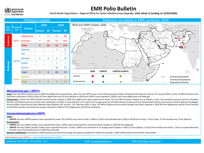 HomeHealthAfghanistan: EMR Polio Bulletin World Health Organization – Regional Office for Eastern... Health Afghanistan: EMR Polio Bulletin World Health Organization – Regional Office for Eastern Mediterranean Issue No. 1433, Week 11 (ending on 22/03/2026) By muhammadhasan0426@gmail.com March 26, 2026 0 1 Share FacebookTwitterPinterestWhatsApp Countries: Afghanistan, Pakistan Source: World Health Organization Please refer to the attached Infographic. Read full story on Reliefweb Share FacebookTwitterPinterestWhatsApp Previous articleSnapchat hit with EU probe into alleged failure to prevent child grooming, illegal goods salesNext articleIntegrated polio-eradication plan inked to make forthcoming 4-day polio eradication drive in Mirpur-AJK complete success RELATED ARTICLES Health Special medical camp organized at Chiniot old age home under CM’s health initiative March 26, 2026 Health Rs 16b cardiology institute to be established in Gujranwala: Minister Salman March 26, 2026 Health Federal government orders mandatory medical exams for grades 17 to 22 officers March 26, 2026 LEAVE A REPLY Cancel reply Comment: Please enter your comment! Name:* Please enter your name here Email:* You have entered an incorrect email address! Please enter your email address here Website: Save my name, email, and website in this browser for the next time I comment. - Advertisment - Most Popular سونے کی قیمت میں زبردست کمی، جانیں آج کا ریٹ March 26, 2026 Big Update for Pilgrims: Pakistan’s Hajj Flights Start April 18 March 26, 2026 Maryam Nawaz attends simple opening ceremony of HBL PSL 11 March 26, 2026 ایوانِ صدر ‘، سول و عسکری قیادت کا اجلاس ‘ پٹرول بحران اور علاقائی جنگ کے سائے میں پاکستان کا بڑا فیصلہ March 26, 2026 Load more Recent Comments