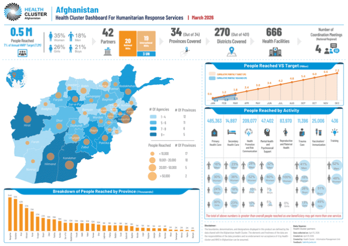 Country: Afghanistan Source: Health Cluster Please refer to the attached file. The dashboard provides an overview of humanitarian health services across Afghanistan, showing coverage, population reached, and overall progress toward annual health targets. It highlights coordinated efforts by partners to deliver essential health services to communities in need.
