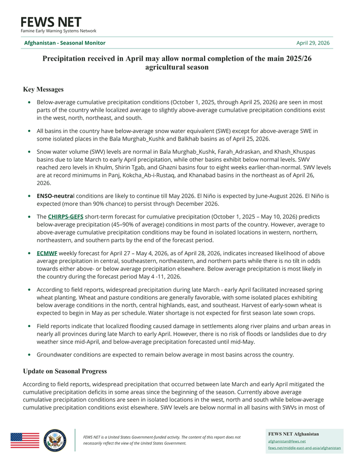 Country: Afghanistan Source: Famine Early Warning System Network Please refer to the attached file. Key Messages Below-average cumulative precipitation conditions (October 1, 2025, through April 25, 2026) are seen in most parts of the country while localized average to slightly above-average cumulative precipitation conditions exist in the west, north, northeast, and south. All basins in the country have below-average snow water equivalent (SWE) except for above-average SWE in some isolated places in the Bala Murghab_Kushk and Balkhab basins as of April 25, 2026. Snow water volume (SWV) levels are normal in Bala Murghab_Kushk, Farah_Adraskan, and Khash_Khuspas basins due to late March to early April precipitation, while other basins exhibit below normal levels. SWV reached zero levels in Khulm, Shirin Tgab, and Ghazni basins four to eight weeks earlier-than-normal. SWV levels are at record minimums in Panj, Kokcha_Ab-i-Rustaq, and Khanabad basins in the northeast as of April 26, 2026. ENSO-neutra l conditions are likely to continue till May 2026. El Niño is expected by June-August 2026. El Niño is expected (more than 90% chance) to persist through December 2026. The CHIRPS-GEFS short-term forecast for cumulative precipitation (October 1, 2025 – May 10, 2026) predicts below-average precipitation (45–90% of average) conditions in most parts of the country. However, average to above-average cumulative precipitation conditions may be found in isolated locations in western, northern, northeastern, and southern parts by the end of the forecast period. ECMWF weekly forecast for April 27 – May 4, 2026, as of April 28, 2026, indicates increased likelihood of above average precipitation in central, southeastern, northeastern, and northern parts while there is no tilt in odds towards either above- or below average precipitation elsewhere. Below average precipitation is most likely in the country during the forecast period May 4 -11, 2026. According to field reports, widespread precipitation during late March – early April facilitated increased spring wheat planting. Wheat and pasture conditions are generally favorable, with some isolated places exhibiting below average conditions in the north, central highlands, east, and southeast. Harvest of early-sown wheat is expected to begin in May as per schedule. Water shortage is not expected for first season late sown crops. Field reports indicate that localized flooding caused damage in settlements along river plains and urban areas in nearly all provinces during late March to early April. However, there is no risk of floods or landslides due to dry weather since mid-April, and below-average precipitation forecasted until mid-May. Groundwater conditions are expected to remain below average in most basins across the country.