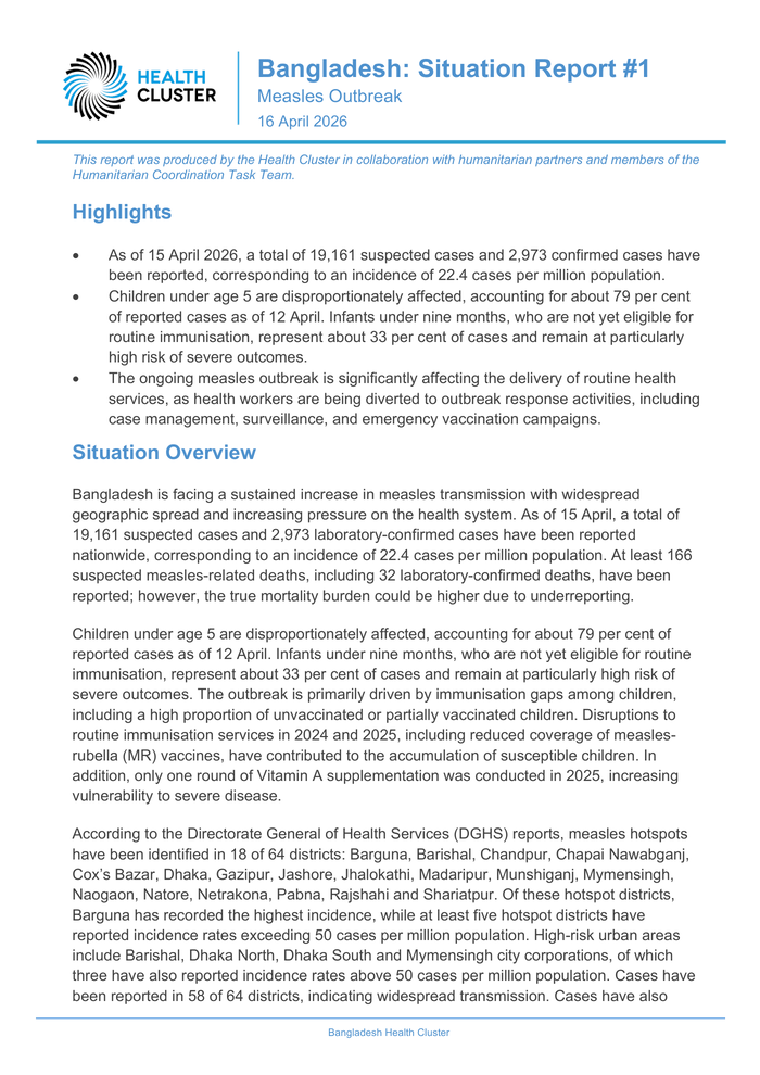HomeHealthBangladesh: Measles Outbreak Health Cluster SitRep #1 Health Bangladesh: Measles Outbreak Health Cluster SitRep #1 By muhammadhasan0426@gmail.com April 23, 2026 0 3 Share FacebookTwitterPinterestWhatsApp Country: Bangladesh Source: World Health Organization Please refer to the attached file. Read full story on Reliefweb Share FacebookTwitterPinterestWhatsApp Previous articleایران کا فیفا ورلڈ کپ 2026 میں شرکت کا اعلانNext articleBangladesh: Measles Outbreak Situation Report #1 – 16 April 2026 RELATED ARTICLES Health پی ٹی اے کی غیر قانونی طبی اشیاء کی فروخت میں ملوث ڈیجیٹل مواد کے خلاف کارروائی April 23, 2026 Health Girl contracts Congo virus, shifted to Quetta hospital April 23, 2026 Health GIMS declares hospital parking free for patients’ families & visitors April 23, 2026 LEAVE A REPLY Cancel reply Comment: Please enter your comment! Name:* Please enter your name here Email:* You have entered an incorrect email address! Please enter your email address here Website: Save my name, email, and website in this browser for the next time I comment. - Advertisment - Most Popular پی ٹی اے کی غیر قانونی طبی اشیاء کی فروخت میں ملوث ڈیجیٹل مواد کے خلاف کارروائی April 23, 2026 King Charles makes big announcement on St George’s Day April 23, 2026 Girl contracts Congo virus, shifted to Quetta hospital April 23, 2026 Entire world witnessed Pakistan’s victory in Marka-e-Haq: Capt Huzifa Ghazi April 23, 2026 Load more Recent Comments