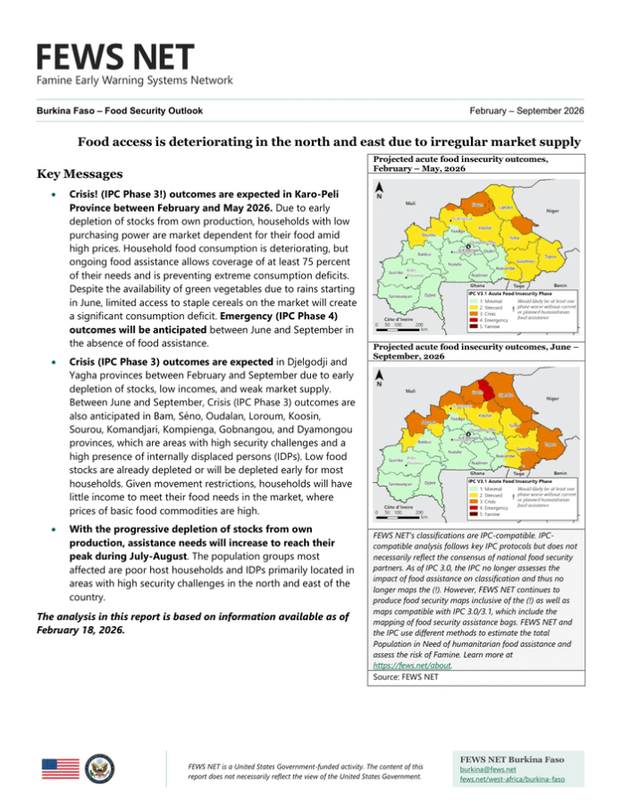 Country: Burkina Faso Source: Famine Early Warning System Network Please refer to the attached file. Key Messages Crisis! (IPC Phase 3!) outcomes are expected in Karo-Peli Province between February and May 2026. Due to early depletion of stocks from own production, households with low purchasing power are market dependent for their food amid high prices. Household food consumption is deteriorating, but ongoing food assistance allows coverage of at least 75 percent of their needs and is preventing extreme consumption deficits. Despite the availability of green vegetables due to rains starting in June, limited access to staple cereals on the market will create a significant consumption deficit. Emergency (IPC Phase 4) outcomes will be anticipated between June and September in the absence of food assistance. Crisis (IPC Phase 3) outcomes are expected in Djelgodji and Yagha provinces between February and September due to early depletion of stocks, low incomes, and weak market supply. Between June and September, Crisis (IPC Phase 3) outcomes are also anticipated in Bam, Séno, Oudalan, Loroum, Koosin, Sourou, Komandjari, Kompienga, Gobnangou, and Dyamongou provinces, which are areas with high security challenges and a high presence of internally displaced persons (IDPs). Low food stocks are already depleted or will be depleted early for most households. Given movement restrictions, households will have little income to meet their food needs in the market, where prices of basic food commodities are high. With the progressive depletion of stocks from own production, assistance needs will increase to reach their peak during July-August. The population groups most affected are poor host households and IDPs primarily located in areas with high security challenges in the north and east of the country. The analysis in this report is based on information available as of February 18, 2026.