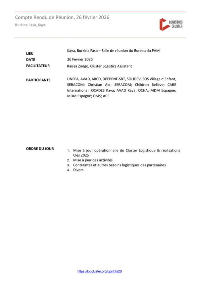 HomeBusinessBurkina Faso, Kaya: Compte Rendu de Réunion, 26 February 2026 Business Burkina Faso, Kaya: Compte Rendu de Réunion, 26 February 2026 By muhammadhasan0426@gmail.com April 20, 2026 0 2 Share FacebookTwitterPinterestWhatsApp Country: Burkina Faso Sources: Logistics Cluster, World Food Programme Please refer to the attached file. Read full story on Reliefweb Share FacebookTwitterPinterestWhatsApp Previous articleپاکستان میں ایچ آئی وی/ایڈز کا تیزی سے پھیلتا ہوا تشویشناک بحران – تحریر: قریش خٹکNext articleDollar and Other Currency Rates Today in Pakistan – April 20, 2026 RELATED ARTICLES Business Apple says chief executive Tim Cook stepping down in September April 20, 2026 Business Anthropic to spend over $100 billion on Amazon’s cloud technology April 20, 2026 Business Amazon to invest up to $25 billion in Anthropic as part of $100 billion cloud deal April 20, 2026 LEAVE A REPLY Cancel reply Comment: Please enter your comment! Name:* Please enter your name here Email:* You have entered an incorrect email address! Please enter your email address here Website: Save my name, email, and website in this browser for the next time I comment. - Advertisment - Most Popular First Balochistan policewoman among two martyred in gun battle April 20, 2026 روہڑی ریلوے اسٹیشن کو جدید سہولیات سے آراستہ کرنےکیلیے اپ گریڈیشن منصوبے کا آغاز April 20, 2026 Apple says chief executive Tim Cook stepping down in September April 20, 2026 سعودی عرب : العلا میں 250 کمروں پر مشتمل جدید اور پُرتعیش ہوٹل کی تعمیر April 20, 2026 Load more Recent Comments