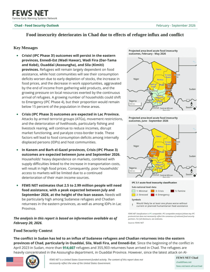 Countries: Chad, Sudan Source: Famine Early Warning System Network Please refer to the attached file. Key Messages Crisis! (IPC Phase 3!) outcomes will persist in the eastern provinces, Ennedi-Est (Wadi Hawar), Wadi Fira (Dar-Tama and Kobé), Ouaddaï (Assoungha), and Sila (Kimiti) provinces. Refugees will remain largely dependent on food assistance, while host communities will see their consumption deficits worsen due to early depletion of stocks, the increase in food prices, and the decrease in work opportunities, aggravated by the end of income from gathering wild products, and the growing pressure on local resources exerted by the continuous arrival of refugees. A growing number of households could shift to Emergency (IPC Phase 4), but their proportion would remain below 15 percent of the population in these areas. Crisis (IPC Phase 3) outcomes are expected in Lac Province. Attacks by armed terrorist groups (ATGs), movement restrictions, and the deterioration of livelihoods, particularly fishing and livestock rearing, will continue to reduce incomes, disrupt market functioning, and paralyze cross-border trade. These factors will lead to food consumption deficits among internally displaced persons (IDPs) and host communities. In Kanem and Barh el-Gazel provinces, Crisis (IPC Phase 3) outcomes are expected between June and September 2026. Households’ heavy dependence on markets, combined with supply difficulties linked to the increase in transportation costs, will result in high food prices. Consequently, poor households’ access to markets will be limited due to a continued deterioration of their main income sources. FEWS NET estimates that 2. 5 to 2. 99 million people will need food assistance, with a peak expected between July and September 2026, at the height of the lean season. Needs will be particularly high among Sudanese refugees and Chadian returnees in the eastern provinces, as well as among IDPs in Lac Province. The analysis in this report is based on information available as of February 20, 2026.