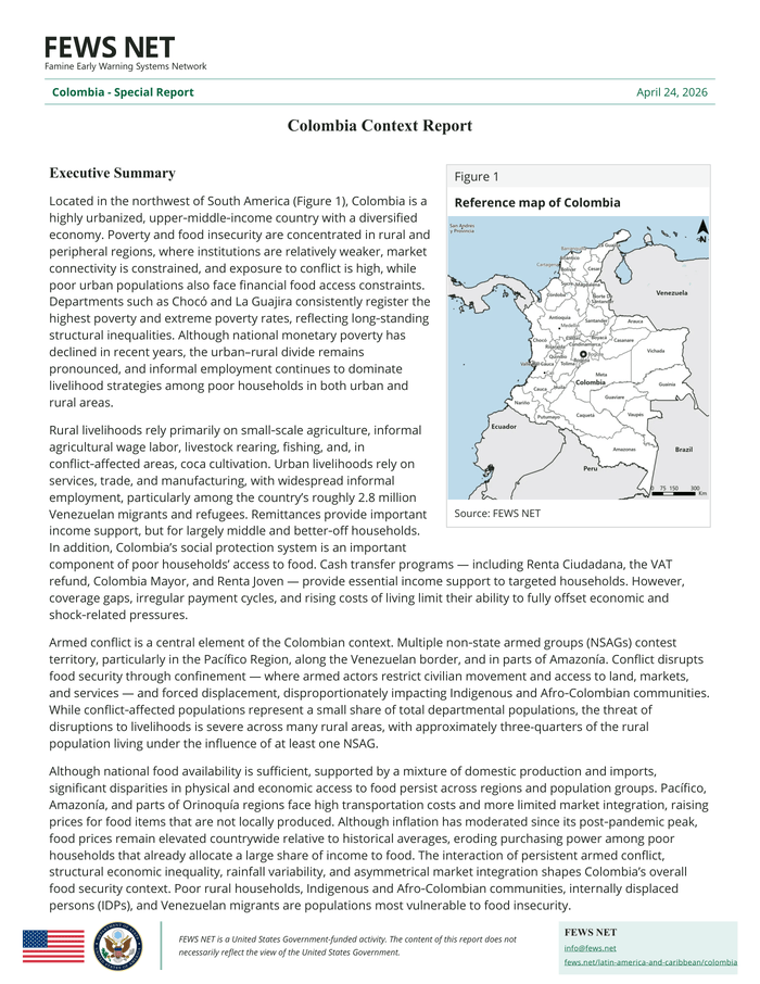 Country: Colombia Source: Famine Early Warning System Network Please refer to the attached file. Colombia Context Report Executive Summary Located in the northwest of South America (Figure 1), Colombia is a highly urbanized, upper‐middle‐income country with a diversified economy. Poverty and food insecurity are concentrated in rural and peripheral regions, where institutions are relatively weaker, market connectivity is constrained, and exposure to conflict is high, while poor urban populations also face financial food access constraints. Departments such as Chocó and La Guajira consistently register the highest poverty and extreme poverty rates, reflecting long‐standing structural inequalities. Although national monetary poverty has declined in recent years, the urban–rural divide remains pronounced, and informal employment continues to dominate livelihood strategies among poor households in both urban and rural areas. Rural livelihoods rely primarily on small‐scale agriculture, informal agricultural wage labor, livestock rearing, fishing, and, in conflict‐affected areas, coca cultivation. Urban livelihoods rely on services, trade, and manufacturing, with widespread informal employment, particularly among the country’s roughly 2. 8 million Venezuelan migrants and refugees. Remittances provide important income support, but for largely middle and better‐off households. In addition, Colombia’s social protection system is an important component of poor households’ access to food. Cash transfer programs — including Renta Ciudadana, the VAT refund, Colombia Mayor, and Renta Joven — provide essential income support to targeted households. However, coverage gaps, irregular payment cycles, and rising costs of living limit their ability to fully offset economic and shock‐related pressures. Armed conflict is a central element of the Colombian context. Multiple non‐state armed groups (NSAGs) contest territory, particularly in the Pacífico Region, along the Venezuelan border, and in parts of Amazonía. Conflict disrupts food security through confinement — where armed actors restrict civilian movement and access to land, markets, and services — and forced displacement, disproportionately impacting Indigenous and Afro‐Colombian communities. While conflict‐affected populations represent a small share of total departmental populations, the threat of disruptions to livelihoods is severe across many rural areas, with approximately three-quarters of the rural population living under the influence of at least one NSAG. Although national food availability is sufficient, supported by a mixture of domestic production and imports, significant disparities in physical and economic access to food persist across regions and population groups. Pacífico, Amazonía, and parts of Orinoquía regions face high transportation costs and more limited market integration, raising prices for food items that are not locally produced. Although inflation has moderated since its post‐pandemic peak, food prices remain elevated countrywide relative to historical averages, eroding purchasing power among poor households that already allocate a large share of income to food. The interaction of persistent armed conflict, structural economic inequality, rainfall variability, and asymmetrical market integration shapes Colombia’s overall food security context. Poor rural households, Indigenous and Afro‐Colombian communities, internally displaced persons (IDPs), and Venezuelan migrants are populations most vulnerable to food insecurity.