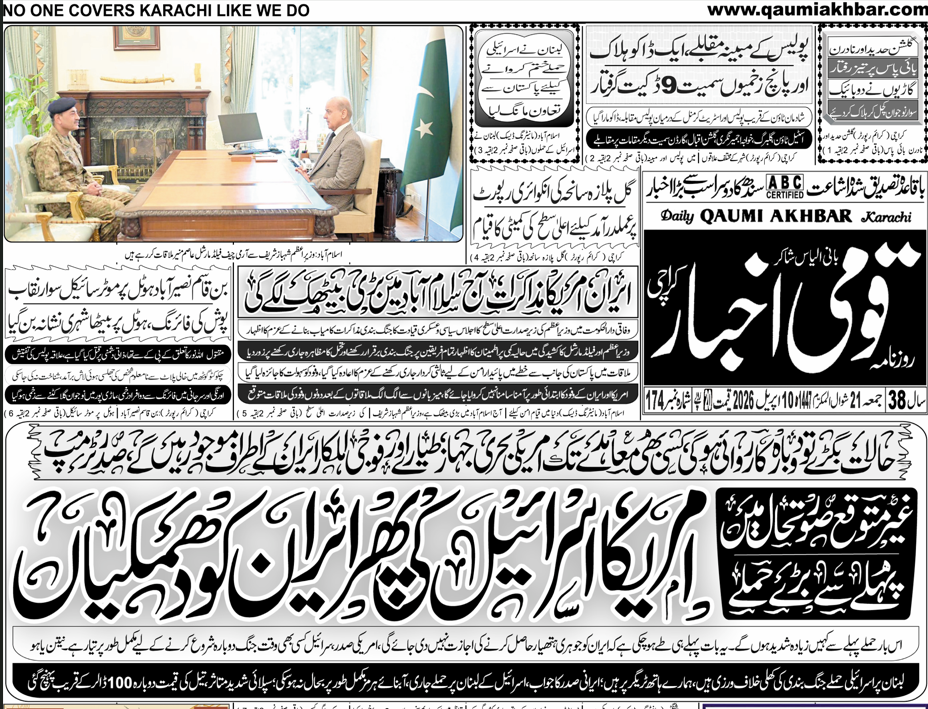 HomeLifestyleDaily Qaumi Akhbar 10-Apr-2026 Lifestyle Daily Qaumi Akhbar 10-Apr-2026 By muhammadhasan0426@gmail.com April 16, 2026 0 5 Share FacebookTwitterPinterestWhatsApp ZOOM TO READ The post Daily Qaumi Akhbar 10-Apr-2026 appeared first on Qaumi Akhbar. Read full story on Qaumi Akhbar Share FacebookTwitterPinterestWhatsApp Previous articleایران کے ساتھ ڈیل ہوگئی، تو اسلام آباد جائوں گا : امریکی صدر ڈونلڈ ٹرمپNext articleiPhone, Samsung devices to get cheaper in Pakistan after Budget 2026? RELATED ARTICLES Lifestyle پاکستان نے یو اے ای کو 2 ارب ڈالر کی ادائیگی کر دی April 18, 2026 Lifestyle PMA Kakul holds grand passing-out parade as cadets vow to defend homeland April 18, 2026 Lifestyle بائیں بازو کی بے حال قیادت اور کارکن…گل محمد منگی April 18, 2026 LEAVE A REPLY Cancel reply Comment: Please enter your comment! Name:* Please enter your name here Email:* You have entered an incorrect email address! Please enter your email address here Website: Save my name, email, and website in this browser for the next time I comment. - Advertisment - Most Popular پاکستان نے یو اے ای کو 2 ارب ڈالر کی ادائیگی کر دی April 18, 2026 PMA Kakul holds grand passing-out parade as cadets vow to defend homeland April 18, 2026 بائیں بازو کی بے حال قیادت اور کارکن…گل محمد منگی April 18, 2026 لبنان میں زخمی 4 اسرائیلی فوجیوں میں سے ایک نے دم توڑ دیا؛ باقی کی حالت بھی نازک April 18, 2026 Load more Recent Comments