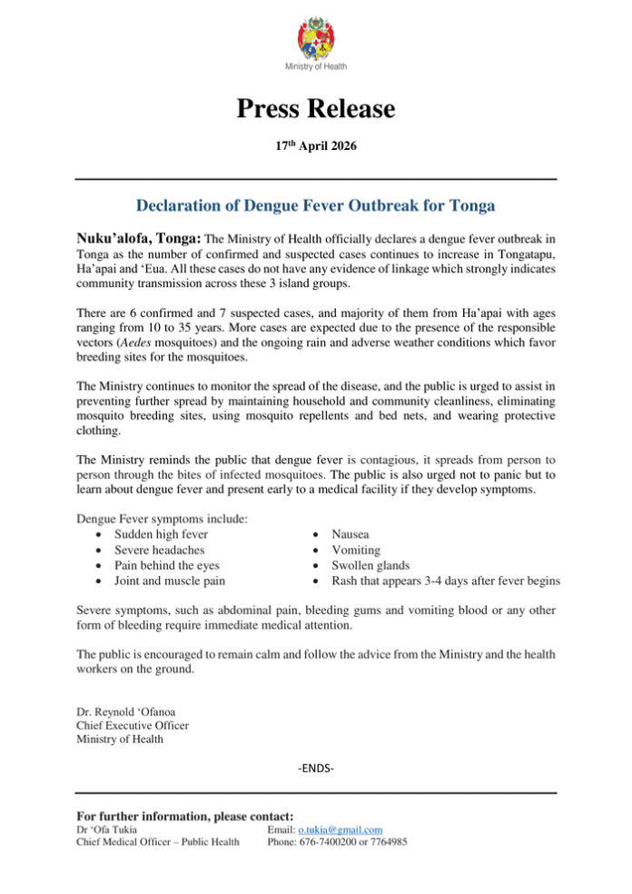 HomeHealthDeclaration of Dengue Fever Outbreak for Tonga