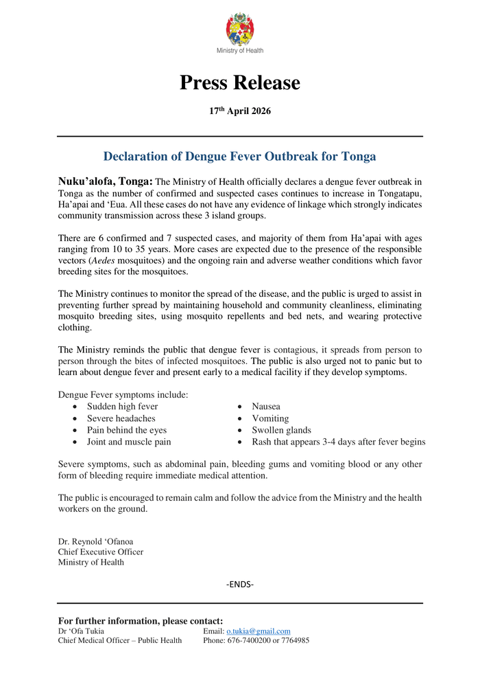 Country: Tonga Source: Government of Tonga Please refer to the attached file. Nuku’alofa, Tonga: The Ministry of Health officially declares a dengue fever outbreak in Tonga as the number of confirmed and suspected cases continues to increase in Tongatapu, Ha’apai and ‘Eua. All these cases do not have any evidence of linkage which strongly indicates community transmission across these 3 island groups. There are 6 confirmed and 7 suspected cases, and majority of them from Ha’apai with ages ranging from 10 to 35 years. More cases are expected due to the presence of the responsible vectors (Aedes mosquitoes) and the ongoing rain and adverse weather conditions which favor breeding sites for the mosquitoes. The Ministry continues to monitor the spread of the disease, and the public is urged to assist in preventing further spread by maintaining household and community cleanliness, eliminating mosquito breeding sites, using mosquito repellents and bed nets, and wearing protective clothing. The Ministry reminds the public that dengue fever is contagious, it spreads from person to person through the bites of infected mosquitoes. The public is also urged not to panic but to learn about dengue fever and present early to a medical facility if they develop symptoms. Dengue Fever symptoms include: Sudden high fever Severe headaches Pain behind the eyes Joint and muscle pain Nausea Vomiting Swollen glands Rash that appears 3-4 days after fever begins Severe symptoms, such as abdominal pain, bleeding gums and vomiting blood or any other form of bleeding require immediate medical attention. The public is encouraged to remain calm and follow the advice from the Ministry and the health workers on the ground. Dr. Reynold ‘Ofanoa Chief Executive Officer Ministry of Health