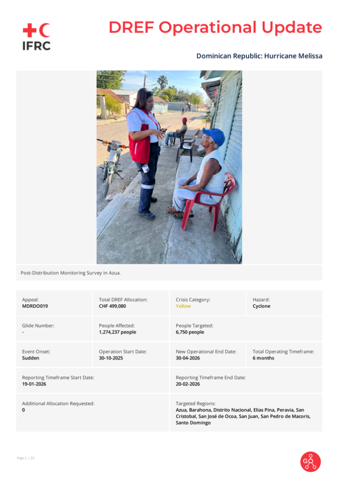 Country: Dominican Republic Source: International Federation of Red Cross and Red Crescent Societies Please refer to the attached file. Description of the Event Date of event 23-10-2025 What happened, where and when? From 21 October 2025 onward, the Dominican Republic experienced heavy rainfall, flooding and landslides as outer bands of Hurricane Melissa impacted the southern and central provinces. The country’s Emergency Operations Center (EOC) declared yellow and green alerts in 22 provinces and the National District, and later red alerts in Barahona, Pedernales, Independencia and Bahoruco, while yellow alerts covered San José de Ocoa, Elías Pina, Dajabón, Azua, San Cristóbal, Peravia, Monte Plata, San Juan and Monte Cristi. Intense rain-induced flooding and landslides severely disrupted water supply and essential services—dozens of aqueducts were out of operation, and several health facilities experienced outages. Based on preliminary estimates the population exposed to the event is approximately 1. 8 million people. The disruption of safe water access and power outages heightened the risk of waterborne disease; ongoing soil saturation and forecast for further rainbands maintained an elevated risk of renewed flooding and landslides.