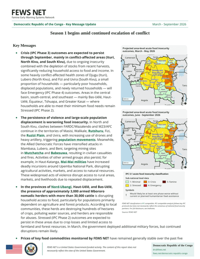Country: Democratic Republic of the Congo Source: Famine Early Warning System Network Please refer to the attached file. Key Messages Crisis (IPC Phase 3) outcomes are expected to persist through September, mainly in conflict-affected areas (Ituri, North Kivu, and South Kivu), due to ongoing insecurity combined with the depletion of stocks from recent harvests, significantly reducing household access to food and income. In some heavily conflict-affected health zones of Djugu (Ituri), Lubero (North Kivu), and Fizi and Uvira (South Kivu), a small proportion of households — particularly poor households, displaced populations, and newly returned households — will face Emergency (IPC Phase 4) outcomes. Areas in the central basin, south-central, and southeast — mainly Bas-Uélé, Haut-Uélé, Équateur, Tshuapa, and Greater Kasai — where households are able to meet their minimum food needs remain Stressed (IPC Phase 2). The persistence of violence and large-scale population displacement is worsening food insecurity. In North and South Kivu, clashes between FARDC/Wazalendo and M23/AFC continue in the territories of Masisi, Walikale, Rutshuru, Fizi, the Ruzizi Plain, and Uvira, with increasing use of drones and heavy artillery, triggering population movements. Meanwhile, the Allied Democratic Forces have intensified attacks in Mambasa, Lubero, and Beni, targeting mining sites in Mutchatcha and Babesuwa, resulting in civilian casualties and fires. Activities of other armed groups also persist; for example, in Haut-Katanga, Mai-Mai militias have increased deadly incursions around Upemba National Park, disrupting agricultural activities, markets, and access to natural resources. These widespread acts of violence disrupt access to rural areas, markets, and livelihoods due to repeated displacement. In the provinces of Nord-Ubangi, Haut-Uélé, and Bas-Uélé, the presence of approximately 3, 000 armed Mbororo nomadic herders with more than 30, 000 cattle is disrupting household access to food, particularly for populations primarily dependent on agriculture and forest products. According to local communities, these herds are destroying hundreds of hectares of crops, polluting water sources, and herders are responsible for abuses. Stressed (IPC Phase 2) outcomes are expected to persist in these areas due to crop losses and limited access to farmland and forest resources. In March, the government deployed additional military forces, but continued disruptions remain likely. Prices of key food commodities monitored by FEWS NET have remained generally stable over the past five months but often exceed the five-year average. Nationally, maize flour prices remained stable compared to February and the annual average, but were 12. 2 percent above the five-year average. Household incomes and purchasing power have deteriorated following years of local currency instability. Conflict-affected areas, particularly in the east, are experiencing further erosion of already limited purchasing power due to gradual price increases driven by declining local production and market disruptions. In Uvira, maize flour prices increased by 6. 2 percent month-on-month, 22 percent year-on-year, and 26. 9 percent above the five-year average. Average rainfall countrywide from March to June is expected to support a typical progression of the Season 1 (S1) cropping cycle; however, below-typical harvest levels are expected in June in eastern provinces due to conflict escalation. Reduced household participation in S1 agricultural activities will limit access to food from own production. Less conflict-affected regions in the central and northeastern bimodal zones are expected to benefit from a timely onset of the S1 rainy season, though some areas may experience a delayed start following below-average rainfall in March. In the unimodal south, agricultural households are beginning green harvests, improving food access through own production. Global oil prices and freight costs for imports have increased due to maritime disruptions linked to the conflict in the Middle East, disrupting fuel flows and increasing inflation risks. Fuel price increases were already observed in March, driven by speculation over petroleum supply, with increases of 10. 1 percent (gasoline), 7. 9 percent (diesel), and 11. 4 percent (refined oil) compared to February. In the medium term, poor households in insecure areas will be the most affected by rising fuel and transport costs, as well as higher prices for goods and services. This will reduce household purchasing power and worsen food access constraints. Limited use of fertilizers (which are imported) is not expected to significantly affect national agricultural production; however, the DRC depends on imports of sulfur, a key input for mining activities. Disruptions in sulfur supply could slow mining production, reduce employment opportunities, and negatively affect the incomes of households dependent on this sector.