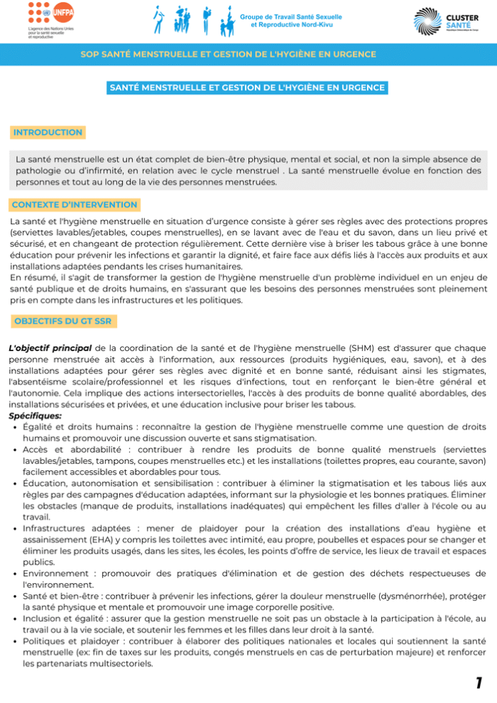 Country: Democratic Republic of the Congo Sources: Health Cluster, United Nations Population Fund Please refer to the attached file. INTRODUCTION La santé menstruelle est un état complet de bien-être physique, mental et social, et non la simple absence de pathologie ou d’infirmité, en relation avec le cycle menstruel. La santé menstruelle évolue en fonction des personnes et tout au long de la vie des personnes menstruées.