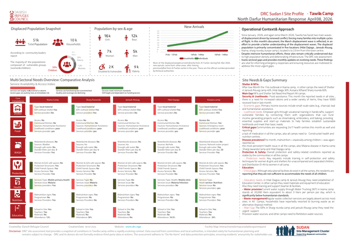 HomeCrimeDRC Sudan | Site Profile - Tawila Camp: North Darfur Humanitarian Response... Crime DRC Sudan | Site Profile – Tawila Camp: North Darfur Humanitarian Response (April 08, 2026) By muhammadhasan0426@gmail.com April 29, 2026 0 2 Share FacebookTwitterPinterestWhatsApp Country: Sudan Source: Danish Refugee Council Please refer to the attached Infographic. Read full story on Reliefweb Share FacebookTwitterPinterestWhatsApp Previous articleٹک ٹاکر ثناء یوسف کے قتل کا ٹرائل دوسری عدالت منتقل کرنے کی درخواست مستردNext articleIndonesian military officers charged over acid attack on rights activist RELATED ARTICLES Crime ایران جنگ کے منفی اثرات کا پھیلاؤ، ملائیشیا کا تمام وزارتوں کے بجٹ میں کٹوتی کا حکم April 29, 2026 Crime کراچی: پراسرار انداز میں تھانے کے لاک اپ سے ملزمان باری باری فرار April 29, 2026 Crime گوجرانوالہ: ماں بیٹی قتل، شوہر کے کہنے پر خاتون کو قتل کیا، زیادتی بھی کی، ملزم کا اعتراف April 29, 2026 LEAVE A REPLY Cancel reply Comment: Please enter your comment! Name:* Please enter your name here Email:* You have entered an incorrect email address! Please enter your email address here Website: Save my name, email, and website in this browser for the next time I comment. - Advertisment - Most Popular پی ایس ایل 11: حیدرآباد اور ملتان سلطانز آمنے سامنے April 29, 2026 Niue (New Zealand): Pacific Region – Coordination Meeting Minutes, Suva, 9 April 2026 April 29, 2026 IHC to hear Imran, Bushra’s pleas against conviction in £190m reference on April 30 April 29, 2026 Government declares May 1 public holiday for Labour Day April 29, 2026 Load more Recent Comments