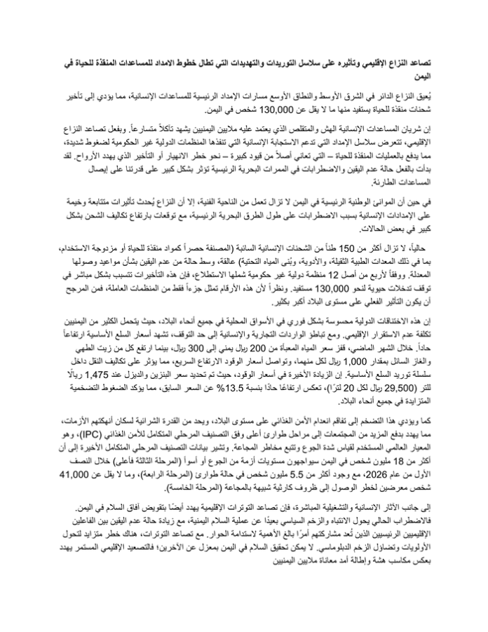 Country: Yemen Source: Oxfam Please refer to the attached file. The conflict in the Middle East and wider region is obstructing key delivery routes for humanitarian supplies, delaying lifesaving shipments for at least 130, 000 people in Yemen. The fragile and shrunken humanitarian lifeline to millions of people is fracturing. Driven by the escalating regional conflict, the supply chains sustaining the response delivered by international non-governmental organizations (INGOs) are under severe strain, pushing already constrained lifesaving operations toward collapse or life-threatening delays. The uncertainty and disruption in key maritime corridors are already heavily impacting our ability to deliver emergency relief. While key national ports in Yemen technically remain operational, the conflict is having dire ripple effects on aid supplies due to disruptions along key sea routes, with shipping costs expected to skyrocket in some cases. Currently, over 150 tons of bulk humanitarian cargo (exclusively classified as lifesaving or dual-purpose items, including heavy medical equipment, pharmaceuticals, and water infrastructure) remain stalled, with uncertainty regarding their revised arrival dates. According to four of the 12 surveyed INGOs, these delays are directly responsible for cutting off critical interventions to those 130, 000 beneficiaries. Because these figures reflect only a fraction of operating INGOs, the true impact across the country is likely significantly higher. These international bottlenecks are being immediately felt in local markets across the country, where many Yemenis are absorbing the cost of regional instability. As commercial and humanitarian imports slow to a halt, basic commodity prices are surging. Over the past month, the cost of bottled water has jumped from 200 Yemeni Rials (YER) to 300 YER, cooking oil and liquid gas have each gone up by 1, 000 YER, and fuel prices continue to climb rapidly, thus impacting transport costs within the supply chain of essential items. A recent fuel price increase, where gasoline and diesel prices were set at 1, 475 YER per liter (29, 500 YER per 20L), reflects a sharp 13. 5% rise from the previous price, underscoring growing inflationary pressures across the country. This inflation directly exacerbates nationwide food insecurity and limits the purchasing power of an already exhausted population, threatening to push more communities into higher emergency phases of the Integrated Food Security Phase Classification (IPC), the global scale used by aid agencies to measure the severity of hunger and track famine. Already, recent IPC data projects that over 18 million people in Yemen will face Crisis levels of hunger or worse (IPC Phase 3+) in the first half of 2026, with over 5. 5 million in Emergency conditions (IPC Phase 4) and at least 41, 000 people at risk of catastrophic, famine-like conditions (IPC Phase 5). Beyond the immediate humanitarian and operational impacts, escalating regional tensions also risk undermining prospects for peace in Yemen. The current volatility diverts attention and political capital away from the Yemeni peace process, while increasing uncertainty among key regional actors whose engagement is critical to sustaining dialogue. As tensions rise, there is a heightened risk of shifting priorities and reduced diplomatic momentum. Peace in Yemen cannot be achieved in isolation; continued regional escalation risks reversing fragile progress and prolonging the suffering of millions of Yemenis. Furthermore, these external shocks are compounded by internal administrative friction affecting the processes required for humanitarian organizations to deliver aid effectively. Safe, unimpeded, and sustained access for humanitarian workers is a core obligation under International Humanitarian Law, and includes not only access within Yemen, but also the ability for international humanitarian personnel to enter and leave the country without undue restrictions. The humanitarian supply chain cannot function without the personnel required to manage it. At present, humanitarian workers face significant movement constraints. According to a recent survey conducted among INGOs, 91 percent of respondent organizations report delays or severe disruptions to staff movement. To avert the collapse of these lifesaving pipelines, the undersigned INGOs urgently call upon all parties to the conflict and the international community to: ● Facilitate the Safe Movement of Humanitarian Personnel: Ensure the safe and predictable movement of all humanitarian staff, recognizing that lifesaving operations rely on a secure environment where aid workers can operate without undue administrative delays or unjust constraints on their mobility. ● Accelerate Administrative Procedures: Facilitate the timely processing of administrative procedures, specifically by accelerating the permissions required to transport lifesaving supplies across the country. ● Promote De-escalation, Protect Civilians and Enable Economic Recovery: Urgently prioritize de-escalation across the region and uphold obligations under international humanitarian law, ensuring the protection of civilians and civilian infrastructure. Sustained peace and stability in the region are essential not only for safeguarding humanitarian operations but also for restoring market functionality, and enabling a pathway toward lasting peace in Yemen. ● Enable Context-Appropriate Procurement Modalities: Support and facilitate the use of national and regional procurement channels, where feasible, to mitigate delays associated with international supply pipelines, while ensuring compliance with applicable regulations and maintaining quality standards. ● Strengthen Local Production and Supply Resilience: Promote and invest in strengthening local and regional production capacities, where feasible, to reduce reliance on external supply chains and enhance resilience to future shocks and disruptions, par