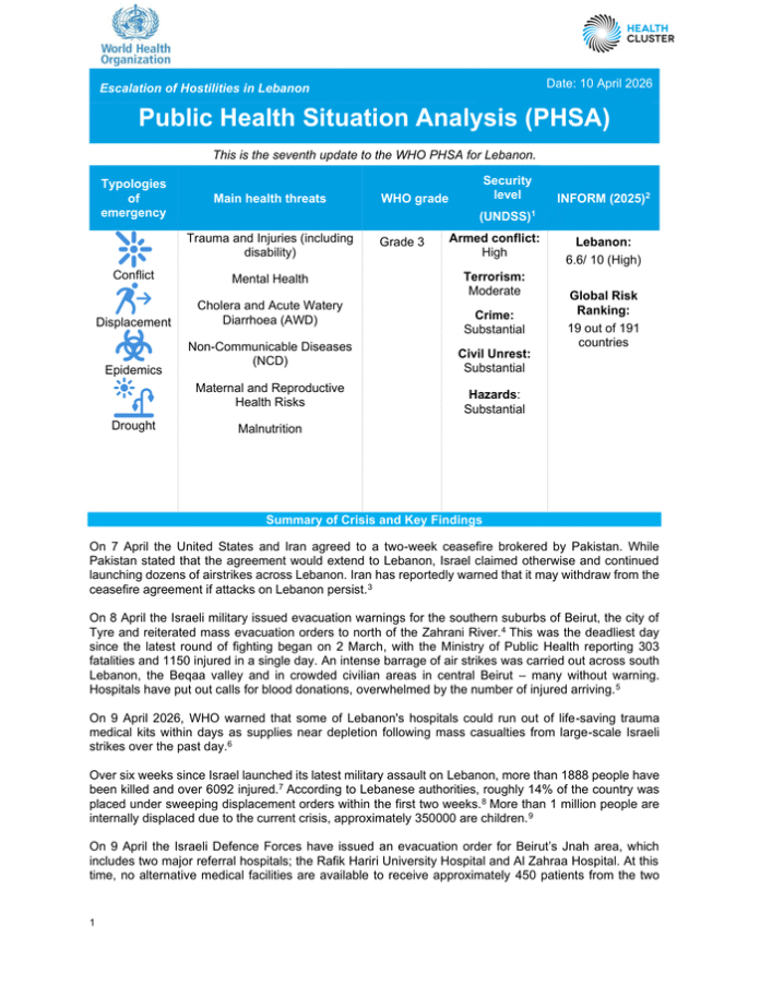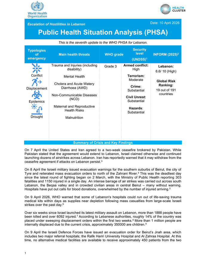 Countries: Lebanon, occupied Palestinian territory, Syrian Arab Republic Sources: Health Cluster, World Health Organization Please refer to the attached file. Summary of Crisis and Key Findings On 7 April the United States and Iran agreed to a two-week ceasefire brokered by Pakistan. While Pakistan stated that the agreement would extend to Lebanon, Israel claimed otherwise and continued launching dozens of airstrikes across Lebanon. Iran has reportedly warned that it may withdraw from the ceasefire agreement if attacks on Lebanon persist. On 8 April the Israeli military issued evacuation warnings for the southern suburbs of Beirut, the city of Tyre and reiterated mass evacuation orders to north of the Zahrani River. This was the deadliest day since the latest round of fighting began on 2 March, with the Ministry of Public Health reporting 303 fatalities and 1150 injured in a single day. An intense barrage of air strikes was carried out across south Lebanon, the Beqaa valley and in crowded civilian areas in central Beirut – many without warning. Hospitals have put out calls for blood donations, overwhelmed by the number of injured arriving. On 9 April 2026, WHO warned that some of Lebanon’s hospitals could run out of life-saving trauma medical kits within days as supplies near depletion following mass casualties from large-scale Israeli strikes over the past day. Over six weeks since Israel launched its latest military assault on Lebanon, more than 1888 people have been killed and over 6092 injured. According to Lebanese authorities, roughly 14% of the country was placed under sweeping displacement orders within the first two weeks. More than 1 million people are internally displaced due to the current crisis, approximately 350000 are children. On 9 April the Israeli Defence Forces have issued an evacuation order for Beirut’s Jnah area, which includes two major referral hospitals; the Rafik Hariri University Hospital and Al Zahraa Hospital. At this time, no alternative medical facilities are available to receive approximately 450 patients from the two hospitals (including 40 patients in the ICU), rendering their evacuation operationally unfeasible. Both facilities are operating at full capacity, including treating the injured from the strikes of 8 April. The escalation of hostilities that erupted in Lebanon in September 2024 has had catastrophic immediate effects on public health, leading to a significant loss of life, widespread injuries, and severe damage to healthcare infrastructure. The conflict had a role in severely disrupting the delivery of essential medical services.