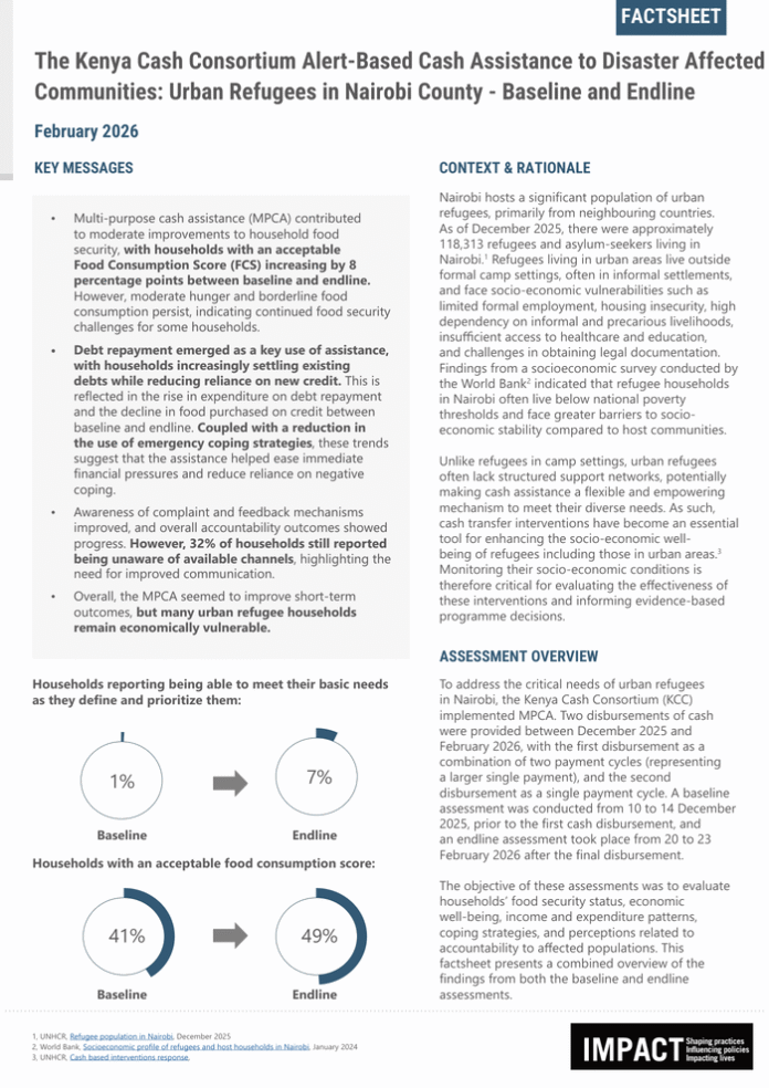 Factsheet: The Kenya Cash Consortium Alert-Based Cash Assistance to Disaster Affected Communities: Urban Refugees in Nairobi County – Baseline and Endline (February 2026)
