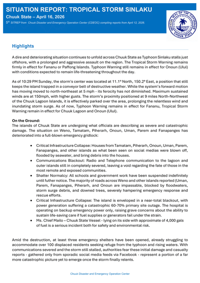 Federated States of Micronesia CDEOC Situation Report No. 5 – Tropical Storm Sinlaku (Chuuk State – April 16, 2026)