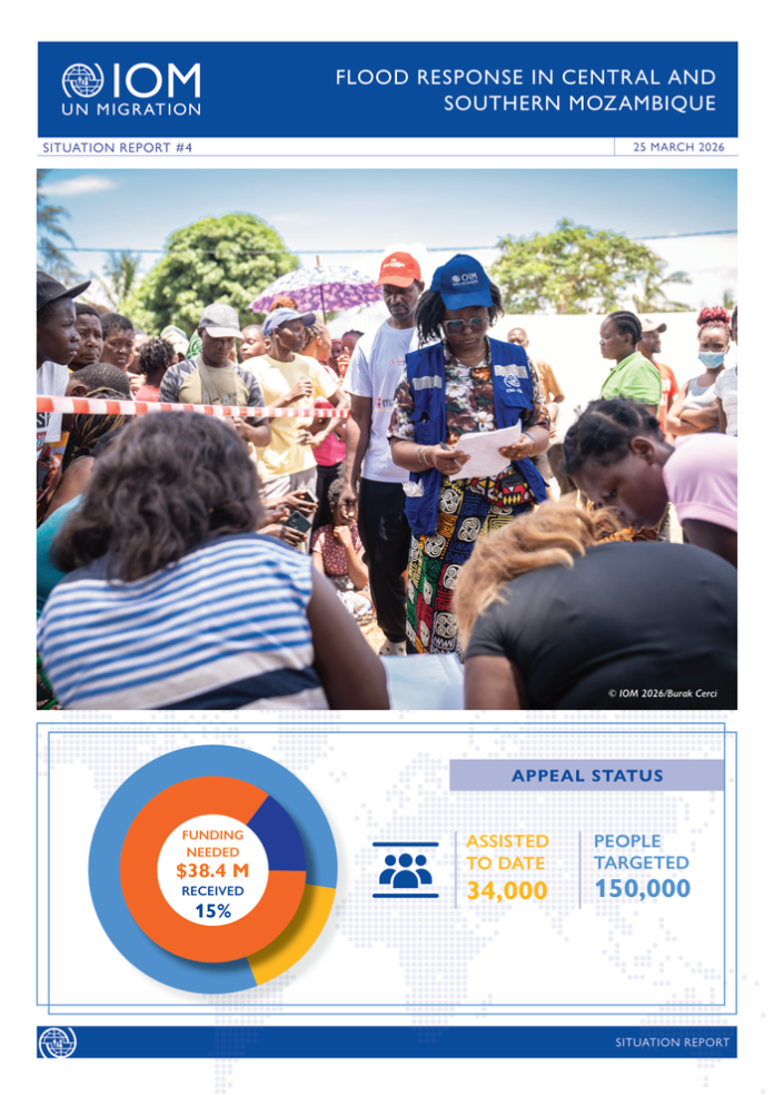 Country: Mozambique Source: International Organization for Migration Please refer to the attached file. SITUATION OVERVIEW Mozambique continues to experience significant humanitarian impacts following extensive flooding, with heavy rainfall continuing to affect much of the country since 1 March 2026, particularly across the southern, central and northern provinces. Continued rainfall since the initial flooding has compounded damage, displacement and humanitarian needs, while river overflow, notably along the Licungo River, has further exacerbated impacts in affected areas. Although water levels have begun to recede in some districts, Gaza Province remains the worst affected, alongside Inhambane, Sofala, Zambézia, Niassa and Tete provinces. The ongoing rains continue to cause widespread damage to homes, public infrastructure and agricultural land, limiting safe returns for many families and prolonging humanitarian needs. Additional rainfall is anticipated across the country in the coming days, with the potential to exacerbate flooding and humanitarian needs. While some affected families have been able to return to their areas of origin, many remain displaced due to ongoing rainfall, damaged or unsafe housing, loss of assets, and limited access to essential services. A significant number of families are residing outside formal accommodation centres, staying with host families or in community facilities and informal sites. Continued monitoring is required to assess conditions in return locations and to ensure that returns are safe, voluntary and sustainable. IOM, in close coordination with the Government of Mozambique, the National Institute for Disaster Management and Risk Reduction (INGD), and humanitarian partners, continues to implement a multisectoral emergency response, including displacement tracking, site management, shelter and non‐food item support, water, sanitation and hygiene assistance, health promotion, protection, and prevention of sexual exploitation and abuse activities. The response prioritizes safe and dignified living conditions, strengthened community engagement mechanisms, and targeted assistance to both displaced and returning populations. As operations adapt to evolving flood‐related impacts and multisectoral support expands across additional districts, IOM interventions have reached an estimated 34, 000 individuals across sectors.