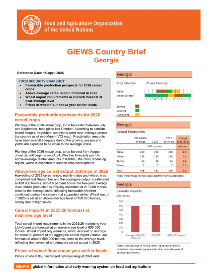 Country: Georgia Source: Food and Agriculture Organization of the United Nations Please refer to the attached file. FOOD SECURITY SNAPSHOT Favourable production prospects for 2026 cereal crops Above-average cereal output obtained in 2025 Wheat import requirements in 2025/26 forecast at near-average level Prices of wheat flour above year-earlier levels Favourable production prospects for 2026 cereal crops Planting of the 2026 wheat crop, to be harvested between July and September, took place last October. According to satellite-based images, vegetation conditions were near-average across the country as of mid-March (VCI map). Precipitation amounts have been overall adequate during the growing season and yields are expected to be close to the average levels. Planting of the 2026 maize crop, to be harvest from August onwards, will begin in mid-April. Weather forecasts point to above-average rainfall amounts in Kakheti, the most producing region, which is expected to support crop development. Above-average cereal output obtained in 2025 Harvesting of 2025 cereal crops, mainly maize and wheat, was completed last September and the aggregate output is estimated at 420 000 tonnes, about 5 percent above the five-year average level. Maize production is officially estimated at 210 000 tonnes, close to the average level, reflecting favourable weather conditions during the season that supported yields. Wheat output in 2025 is set at an above-average level of 150 000 tonnes, mainly due to high yields. Cereal imports in 2025/26 forecast at near ‐ average level Total cereal import requirements in the 2025/26 marketing year (July/June) are forecast at a near-average level of 600 000 tonnes. Wheat import requirements, which account on average for about 90 percent of the aggregate cereal import volume, are forecast at around 550 000 tonnes, close to the average level, reflecting the harvest of an adequate cereal output in 2025. Prices of wheat flour above year-earlier levels Prices of wheat flour increased between August 2024 and June 2025, then remained largely stable until February 2026 and were 8 percent higher year-on-year, as of February 2026. The increase reflects limited domestic availability and above-average inputs costs, despite ongoing Valued Addede Tax (VAT) exemptions intended to stabilize prices. According to the National Statistics Office of Georgia (GeoStat), annual inflation increased from 1. 1 percent in 2024 to 3. 9 percent in 2025 and further to 4. 3 percent in 2026 as of March, mainly driven by rising food prices and overall consumer price growth.