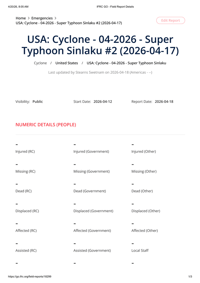 Countries: Guam, Northern Mariana Islands (The United States of America) Source: International Federation of Red Cross and Red Crescent Societies Please refer to the attached file. Description This week, Super Typhoon Sinlaku made landfall in the Northern Mariana Islands before striking Guam and the Commonwealth of Northern Mariana Islands (CNMI). In the CNMI, the islands of Saipan and Tinian were directly struck with heavy rain, mass flooding and extreme winds. Reports confirm widespread power outages, extreme flooding, and destroyed roofs are reported across the islands. A long recovery is expected, with power outages predicted to last from weeks to months. Guam was indirectly hit by the typhoon, and sustained torrential rain, flash flooding, and general disruptions across the island. Request For Assistance Government Requests International Assistance No NS Requests International Assistance No Information Bulletin Published No Actions taken by National Society General Evacuation Shelter Relief/Supply distribution Summary As airports and flights open, additional responders are moving into the affected areas. Teams are supporting evacuation shelters, distributing emergency supplies, and starting assessments. Coordination closely with local emergency management, FEMA, and community partners is ongoing. Actions taken by others A federal emergency declaration is in place, authorizing the US Federal Emergency Agency to provide emergency protective measures and direct federal assistance to the disaster.