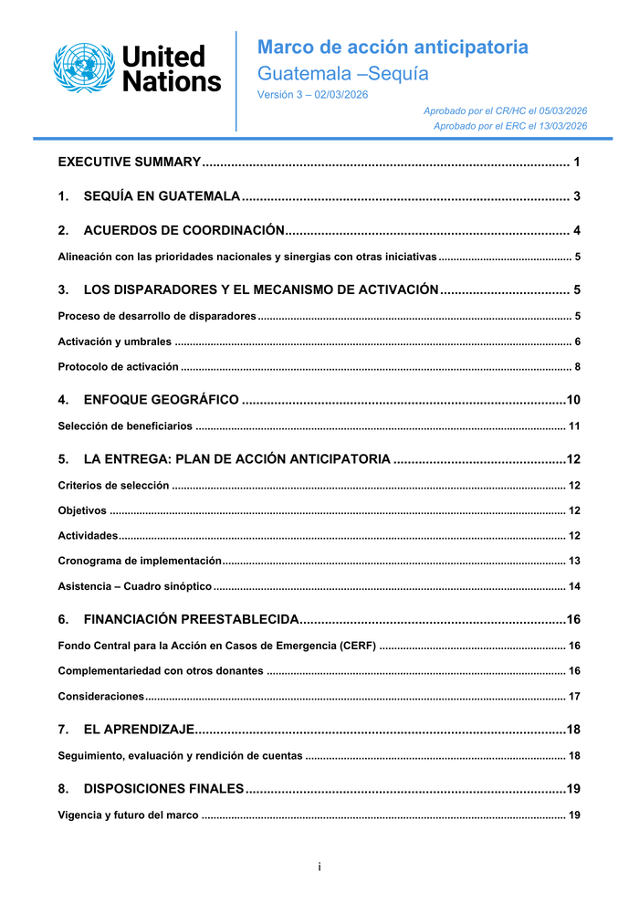 Country: Guatemala Source: UN Office for the Coordination of Humanitarian Affairs Please refer to the attached file. Executive Summary The humanitarian community is scaling up anticipatory action (AA), enabling proactive mobilisation of assistance to get ahead of predictable climate-related shocks and disease outbreaks through robust forecasting (triggers), pre-agreed activities, and pre-arranged funding. This approach has proven effective, dignified, cost-efficient, and protective of development gains. This document presents the anticipatory action framework for drought in Guatemala. It entails a coordinated package of assistance planned to be delivered to people at risk of drought in the prioritized departments of Chiquimula, Zacapa, Jalapa and El Progreso. The framework was developed through a participatory process with humanitarian partners that are part of the Anticipatory Action advisory group, with technical support from OCHA and under the overall leadership of the Resident Coordinator (RC). The financing This framework pre‐arranges US $4 million in pooled‐fund financing in 2026-2027 from the UN’s Central Emergency Response Fund (CERF) to protect up to 60, 000 people in the country through timely, targeted multi-sectoral assistance. The pre-arranged CERF funding is dedicated specifically for this framework and does neither guarantee nor preclude Guatemala’ access to CERF rapid response funding for unforeseen severe humanitarian emergencies that may occur in the country during the validity period, whether related to droughts or other crises. The participating agencies have made a remarkable effort to mobilize their own resources and link the framework with initiatives funded by other donors to cover the costs associated to preparedness strategies. The trigger Triggers are based on seasonal precipitation forecasts obtained from the European Centre for Medium Range Forecasts (ECMWF SEAS5). The forecasts are aggregated at sub-national level (Departments of Chiquimula, Jalapa, El Progreso and Zacapa). The seasonal thresholds are set individually per lead time to approximate a combined annual return period of 1 in 3 years (1 in 2. 92) for the activation of the framework in either season. • “Window A” activities are triggered based on individual thresholds defined for each monitoring moment/lead time, derived from empirical return period calculations using historical ECMWF SEAS5 forecasts. These individual thresholds combine to produce an overall seasonal activation return period of approximately 1 in 3. 5 years (see individual thresholds in table 3). •“Window B” activities are triggered based on individual thresholds defined for each monitoring moment/lead time, derived from empirical return period calculations using historical ECMWF SEAS5 forecasts. These individual thresholds combine to produce an overall seasonal activation return period of approximately 1 in 4. 4 years (see individual thresholds in table 3).