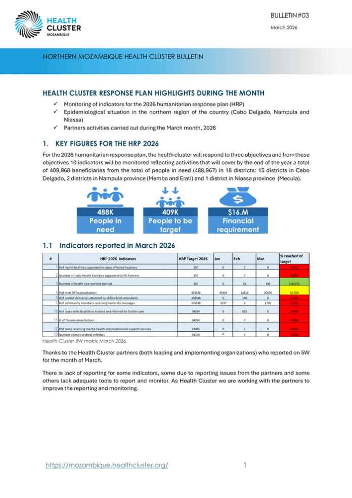 Country: Mozambique Sources: Health Cluster, World Health Organization Please refer to the attached file. HEALTH CLUSTER RESPONSE PLAN HIGHLIGHTS DURING THE MONTH ✓ Monitoring of indicators for the 2026 humanitarian response plan (HRP) ✓ Epidemiological situation in the northern region of the country (Cabo Delgado, Nampula and Niassa) ✓ Partners activities carried out during the March month, 2026 1. KEY FIGURES FOR THE HRP 2026 For the 2026 humanitarian response plan, the health cluster will respond to three objectives and from these objectives 10 indicators will be monitored reflecting activities that will cover by the end of the year a total of 409, 968 beneficiaries from the total of people in need (488, 967) in 18 districts: 15 districts in Cabo Delgado, 2 districts in Nampula province (Memba and Erati) and 1 district in Niassa province (Mecula).