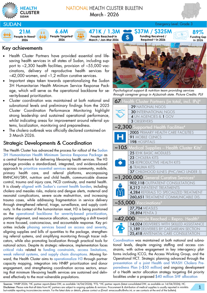 HomeHealthHealth Cluster Sudan Bulletin (March 2026) Health Health Cluster Sudan Bulletin (March 2026) By muhammadhasan0426@gmail.com April 19, 2026 0 2 Share FacebookTwitterPinterestWhatsApp Country: Sudan Sources: Health Cluster, World Health Organization Please refer to the attached file. Read full story on Reliefweb Share FacebookTwitterPinterestWhatsApp Previous articleایل پی جی مافیا بے لگام!420روپے فی کلو میں فروخت،شہری پریشانNext articleHailey Bieber seals Justin Bieber love for life with new beginnings RELATED ARTICLES Health Health Sector Syria update biweekly national and sub-national health sector coordination 1 – 15 April 2026 April 19, 2026 Health اسلام آباد: ایچ آئی وی مخصوص گروپس سے نکل کر عام آبادی میں پھیل رہا ہے، ماہرین صحت April 19, 2026 Health پاکستان میں ایچ آئی وی مخصوص گروپس سے نکل کر عام آبادی میں پھیلنے لگا April 19, 2026 LEAVE A REPLY Cancel reply Comment: Please enter your comment! Name:* Please enter your name here Email:* You have entered an incorrect email address! Please enter your email address here Website: Save my name, email, and website in this browser for the next time I comment. - Advertisment - Most Popular اریکا حق کے ساتھ تعلقات؛عاشر وجاہت نے خاموشی توڑدی April 19, 2026 One Star, Two Looks: Maya Ali’s dual roles leave fans stunned April 19, 2026 Pope Leo seeks to ease tensions with Trump over remarks April 19, 2026 Sajal Aly serves candid charm in ‘Zanjeerain Bts’ April 19, 2026 Load more Recent Comments