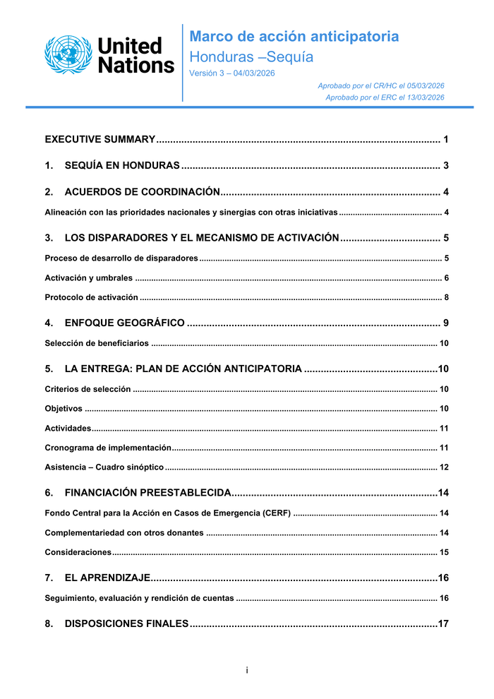 Country: Honduras Source: UN Office for the Coordination of Humanitarian Affairs Please refer to the attached file. Executive Summary The humanitarian community is scaling up anticipatory action (AA), enabling proactive mobilisation of assistance to get ahead of predictable climate-related shocks and disease outbreaks through robust forecasting (triggers), pre-agreed activities, and pre-arranged funding. This approach has proven effective, dignified, cost-efficient, and protective of development gains. This document presents the anticipatory action framework for drought in Honduras. It entails a coordinated package of assistance planned to be delivered to people at risk of drought in the prioritized departments of El Paraíso (Texiguat, Vado Ancho) and Francisco Morazán (Curarén, Alubarén, Reitoca). The framework was developed through a participatory process with humanitarian partners that are part of the Anticipatory Action working group, coordinated by OCHA, under the overall leadership of the Resident Coordinator (RC). The financing This framework pre‐arranges US $4 million in pooled‐fund financing in 2026-2027 from the UN’s Central Emergency Response Fund (CERF) to protect up to 65, 000 people in the country through timely, targeted multi-sectoral assistance. The pre-arranged CERF funding is dedicated specifically for this framework and does neither guarantee nor preclude Honduras’ access to CERF rapid response funding for unforeseen severe humanitarian emergencies that may occur in the country during the validity period, whether related to droughts or other crises. The participating agencies have made a remarkable effort to mobilize their own resources and link the framework with initiatives funded by other donors to cover the costs associated to preparedness strategies. The trigger Triggers are based on seasonal precipitation forecasts obtained from the European Centre for Medium Range Forecasts (ECMWF SEAS5). The forecasts are aggregated at sub-national level (Departments of Paraíso and Francisco Morazán). The seasonal thresholds are set individually per lead time to approximate a combined annual return period of 1 in 3 years (1 in 2. 92) for the activation of the framework in either season. • “Window A” activities are triggered based on individual thresholds defined for each monitoring moment/lead time, derived from empirical return period calculations using historical ECMWF SEAS5 forecasts. These individual thresholds combine to produce an overall seasonal activation return period of approximately 1 in 3. 5 years (see individual thresholds in table 3). •“Window B” activities are triggered based on individual thresholds defined for each monitoring moment/lead time, derived from empirical return period calculations using historical ECMWF SEAS5 forecasts. These individual thresholds combine to produce an overall