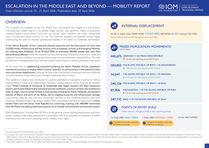Countries: Iran (Islamic Republic of), Afghanistan, Armenia, Azerbaijan, Iraq, Lebanon, Pakistan, Syrian Arab Republic, Türkiye, Turkmenistan Source: International Organization for Migration Please refer to the attached file. The escalation of hostilities across the Middle East and beyond has triggered a humanitarian crisis spanning multiple regions in an already fragile context, with significant impact to population mobility. National social systems and host community safety networks are under considerable strain as protection needs continue to rise. The indefinite cessations of hostilities remain fragile, underscoring the need to maintain operational readiness in the event of a potential deterioration. In the Islamic Republic of Iran, extensive physical insecurity and the destruction of more than 125, 000 civilian infrastructure and key services, such as hospitals, schools, and emergency facilities, are reducing basic liveability. As of 10 April 2026, an estimated 300, 000 people have seen their homes directly affected. While the ceasefire has reduced insecurity, widespread destruction, rubble and explosive remnants continue to constrain access to basic services and hinder response efforts. At the same time, in neighbouring countries bordering the Islamic Republic of Iran, population movements continue to largely reflect routine, seasonal, or precautionary travel patterns rather than crisis‐driven displacement. The ceasefire in Lebanon has contributed to a partial stabilisation of population movements, with an initial slowdown in large‐scale displacement. However, mobility patterns remain fluid and the situation fragile. While hundreds of thousands of households have begun cautious and often temporary returns, particularly influenced by perceived security conditions, access to services and conditions in areas of origin, returns remain limited in several areas, including the South, Nabatieh, the southern suburbs of Beirut and parts of the Bekaa, due to ongoing insecurity and infrastructure damage. Crossborder flows into the Syrian Arab Republic are continuing, reaching over 400, 000 movements since 02 March and placing additional pressure on an already overstretched humanitarian system.