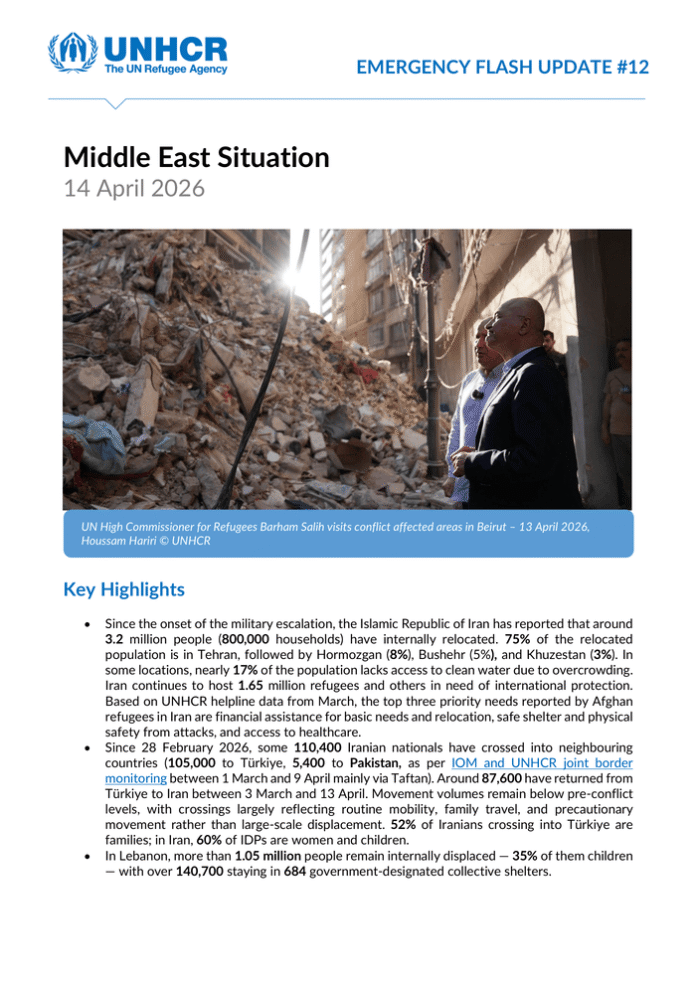 Countries: Iran (Islamic Republic of), Afghanistan, Armenia, Iraq, Lebanon, Pakistan, Syrian Arab Republic, Türkiye, Turkmenistan Source: UN High Commissioner for Refugees Please refer to the attached file. Key Highlights • Since the onset of the military escalation, the Islamic Republic of Iran has reported that around 3. 2 million people (800, 000 households) have internally relocated. 75% of the relocated population is in Tehran, followed by Hormozgan (8%), Bushehr (5%), and Khuzestan (3%). In some locations, nearly 17% of the population lacks access to clean water due to overcrowding. Iran continues to host 1. 65 million refugees and others in need of international protection. Based on UNHCR helpline data from March, the top three priority needs reported by Afghan refugees in Iran are financial assistance for basic needs and relocation, safe shelter and physical safety from attacks, and access to healthcare. • Since 28 February 2026, some 110, 400 Iranian nationals have crossed into neighbouring countries (105, 000 to Türkiye, 5, 400 to Pakistan, as per IOM and UNHCR joint border monitoring between 1 March and 9 April mainly via Taftan). Around 87, 600 have returned from Türkiye to Iran between 3 March and 13 April. Movement volumes remain below pre-conflict levels, with crossings largely reflecting routine mobility, family travel, and precautionary movement rather than large-scale displacement. 52% of Iranians crossing into Türkiye are families; in Iran, 60% of IDPs are women and children. • In Lebanon, more than 1. 05 million people remain internally displaced — 35% of them children — with over 140, 700 staying in 684 government-designated collective shelters. • ~236, 800 Syrians and 43, 900 Lebanese have crossed from Lebanon into Syria since the start of the crisis; 68, 084 Syrians reported an intention to return permanently. • Over 134, 100 Afghans have returned from Iran and Pakistan since the start of the crisis (65, 800 from Iran, 68, 300 from Pakistan). 76% of UNHCR-assisted returnees were women and children. Top provinces of intended return are Kabul (11%) and Nangarhar (10%). In Afghanistan, 115, 000 people are internally displaced, 73% of whom are women and children. Protection concerns have arisen in displacement sites, with authorities ordering IDPs in seven sites to return to their areas of origin; two sites have already been fully vacated. For the latest information on population movements, see the latest UNHCR CORE Update and newly launched Operational Data Portal page on the Middle East situation.