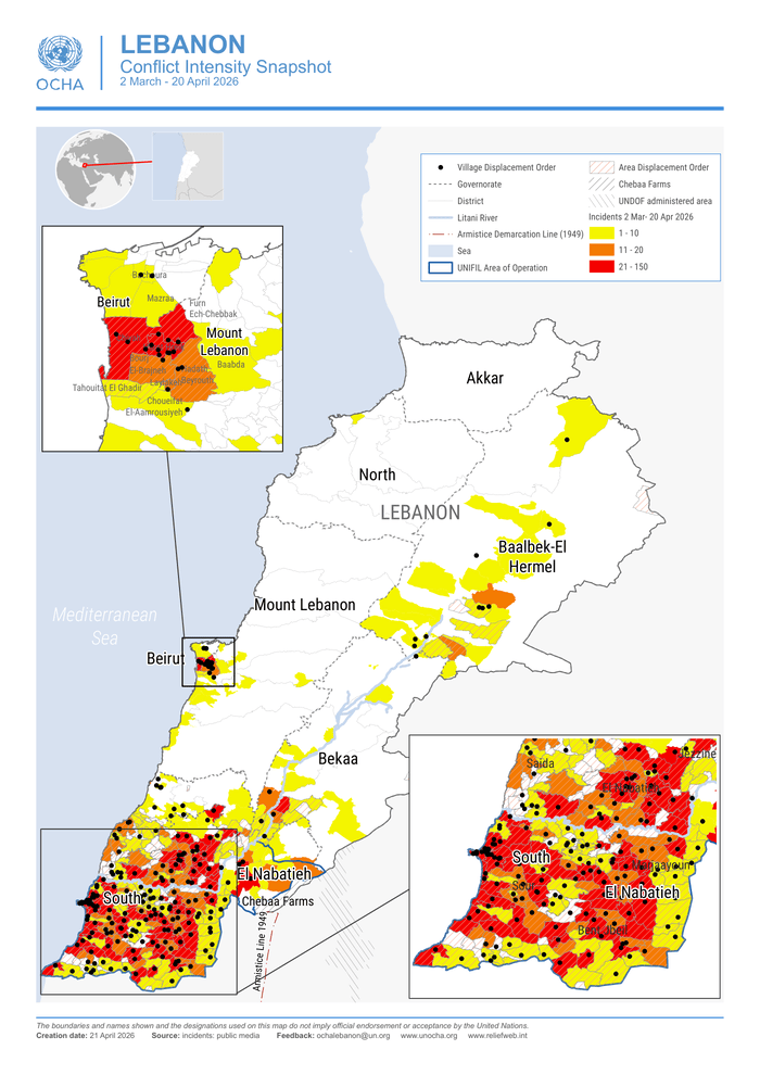 HomePoliticsLebanon: Conflict Intensity, 2 March - 20 April 2026 Politics Lebanon: Conflict Intensity, 2 March – 20 April 2026 By muhammadhasan0426@gmail.com April 21, 2026 0 2 Share FacebookTwitterPinterestWhatsApp Country: Lebanon Source: UN Office for the Coordination of Humanitarian Affairs Please refer to the attached Map. Read full story on Reliefweb Share FacebookTwitterPinterestWhatsApp Previous articleFakhar’s ton helps Qalandars beat Gladiators by nine runs in thrilling encounterNext articleچترال: چینی کمپنی کا کان کنی کی لیز کی منسوخی کے خلاف عدالت سے رجوع RELATED ARTICLES Politics Nawaz questions K-P governance record April 21, 2026 Politics JI for united front against ‘failed system’ April 21, 2026 Politics Ishaq Dar, Saudi FM discuss latest regional developments April 21, 2026 LEAVE A REPLY Cancel reply Comment: Please enter your comment! Name:* Please enter your name here Email:* You have entered an incorrect email address! Please enter your email address here Website: Save my name, email, and website in this browser for the next time I comment. - Advertisment - Most Popular McDonald’s employee flees after stabbing coworker in Virginia April 21, 2026 فخر زمان کا بیٹ آگ بن گیا، دھواں دار سنچری April 21, 2026 Rawalpindi opt to set target against in-form Multan in crucial PSL clash April 21, 2026 اسحاق ڈار اور سعودی وزیر خارجہ میں اہم ٹیلیفونک رابطہ April 21, 2026 Load more Recent Comments