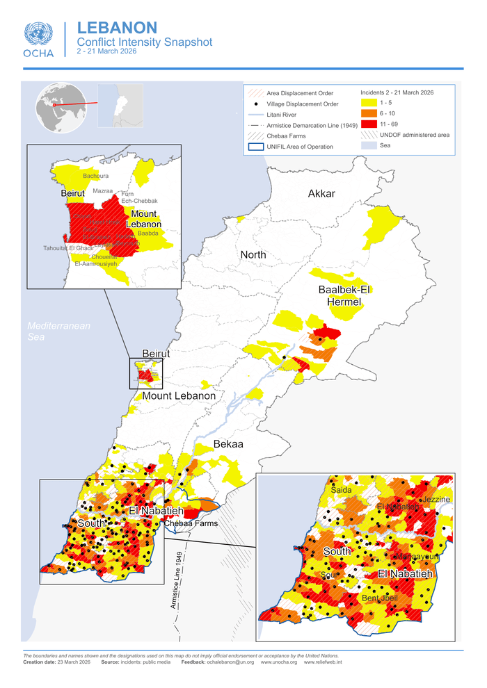 HomePoliticsLebanon: Conflict Intensity, 2 March - 21 March 2026 Politics Lebanon: Conflict Intensity, 2 March – 21 March 2026 By muhammadhasan0426@gmail.com March 23, 2026 0 1 Share FacebookTwitterPinterestWhatsApp Country: Lebanon Source: UN Office for the Coordination of Humanitarian Affairs Please refer to the attached file. Read full story on Reliefweb Share FacebookTwitterPinterestWhatsApp Previous articleSahiwal Power Plant keeps grid stable during Ramazan surgeNext articleTwo injured in Karachi firing RELATED ARTICLES Politics Next National Assembly session likely to be held on March 30 March 24, 2026 Politics CPEC Phase 2.0 and Chinese Leadership Persuasions March 24, 2026 Politics Jordan condemns Iranian attack on Bahrain that killed Moroccan contractor March 24, 2026 LEAVE A REPLY Cancel reply Comment: Please enter your comment! Name:* Please enter your name here Email:* You have entered an incorrect email address! Please enter your email address here Website: Save my name, email, and website in this browser for the next time I comment. - Advertisment - Most Popular James Marsden admitted he ‘lied’ on ‘Jimmy Kimmel’ show March 24, 2026 Alan Jackson welcomes first granddaughter as he prepares to bid ‘goodbye’ March 24, 2026 Alexandra Grant reveals what pushed her to deny Keanu Reeves wedding speculations March 24, 2026 Next National Assembly session likely to be held on March 30 March 24, 2026 Load more Recent Comments