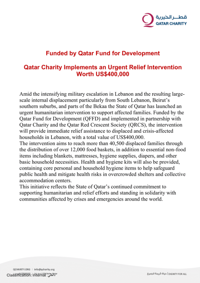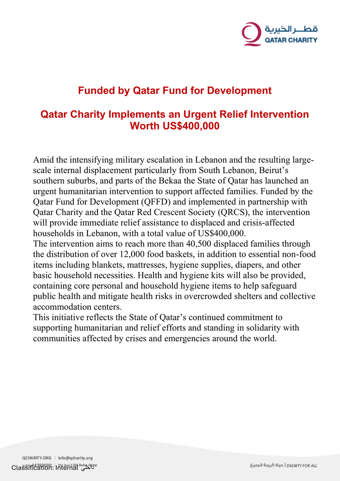 Country: Lebanon Source: Qatar Charity Please refer to the attached file. Amid the intensifying military escalation in Lebanon and the resulting largescale internal displacement particularly from South Lebanon, Beirut’s southern suburbs, and parts of the Bekaa the State of Qatar has launched an urgent humanitarian intervention to support affected families. Funded by the Qatar Fund for Development (QFFD) and implemented in partnership with Qatar Charity and the Qatar Red Crescent Society (QRCS), the intervention will provide immediate relief assistance to displaced and crisis-affected households in Lebanon, with a total value of US$400, 000. The intervention aims to reach more than 40, 500 displaced families through the distribution of over 12, 000 food baskets, in addition to essential non-food items including blankets, mattresses, hygiene supplies, diapers, and other basic household necessities. Health and hygiene kits will also be provided, containing core personal and household hygiene items to help safeguard public health and mitigate health risks in overcrowded shelters and collective accommodation centers. This initiative reflects the State of Qatar’s continued commitment to supporting humanitarian and relief efforts and standing in solidarity with communities affected by crises and emergencies around the world.