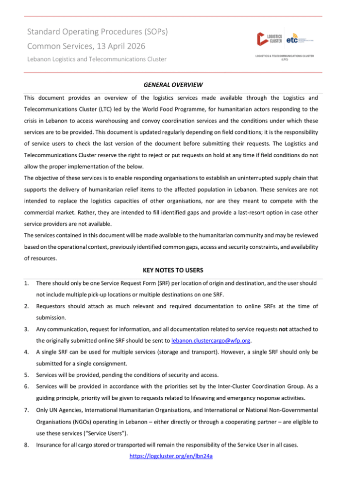 Lebanon Logistics and Telecommunications Cluster: Standard Operating Procedures (SOPs) – Common Services (13 April 2026)