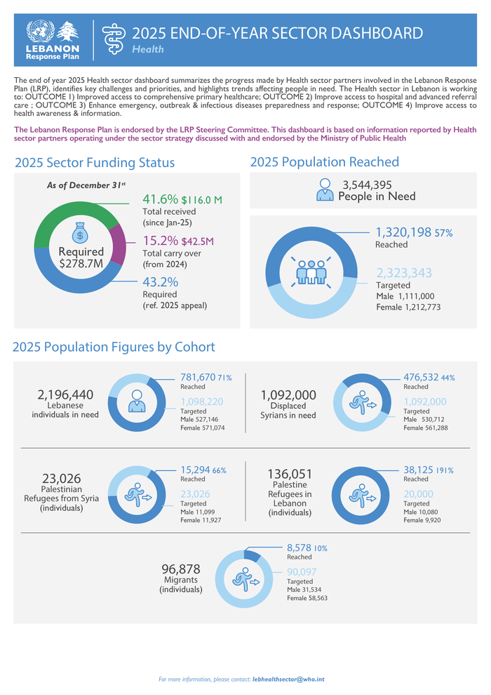 HomeHealthLebanon Response Plan: Health Sector Dashboard - End of Year 2025 Health Lebanon Response Plan: Health Sector Dashboard – End of Year 2025 By muhammadhasan0426@gmail.com April 16, 2026 0 3 Share FacebookTwitterPinterestWhatsApp Country: Lebanon Sources: Health Cluster, World Health Organization Please refer to the attached Infographic. Read full story on Reliefweb Share FacebookTwitterPinterestWhatsApp Previous articleNo date set for second round of US-Iran talks, FO saysNext articleCDA demolishes over 200 houses in anti-encroachment operation in Islamabad RELATED ARTICLES Health اسلام آباد میں ایچ آئی وی کے کیسز میں خطرناک اضافہ، نوجوان مرد سب سے زیادہ متاثر April 18, 2026 Health Rising Paediatric HIV Infections Expose Healthcare Lapses In Pakistan April 18, 2026 Health Chinese study finds higher intake of calcium significantly decreases likelihood of age-related macular degeneration April 18, 2026 LEAVE A REPLY Cancel reply Comment: Please enter your comment! Name:* Please enter your name here Email:* You have entered an incorrect email address! Please enter your email address here Website: Save my name, email, and website in this browser for the next time I comment. - Advertisment - Most Popular وزیراعظم شہباز شریف کا سعودی عرب، قطر اور ترکیہ کا دورہ مکمل: علاقائی امن اور معاشی استحکام کے نئے دور کا آغاز April 18, 2026 GWU strengthens international partnerships with CPC Central Committee in Beijing April 18, 2026 Fake Claim about Pakistan Army General Hassan Khattak’s detention debunked April 18, 2026 Saudi Arabia reiterates Hajj permit rule to safeguard pilgrims in 2026 April 18, 2026 Load more Recent Comments