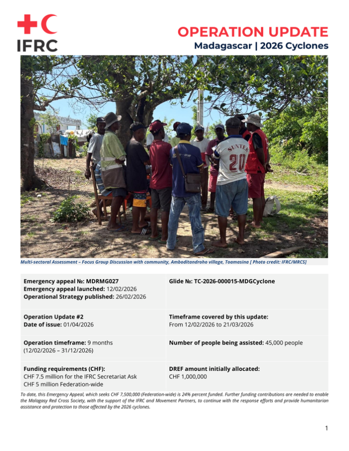 Country: Madagascar Source: International Federation of Red Cross and Red Crescent Societies Please refer to the attached file. A. SITUATION ANALYSIS Description of the crisis In late January and February 2026, Madagascar was struck by two major cyclones within just ten days: Fytia and Gezani. The cumulative impact left communities with extensive shelter needs, cut off from food, health services, and essential supplies. Tropical Cyclone (TC) Fytia made landfall on 31st January 2026 as a Category 3 system, crossing Madagascar on 1 February 2026 before gradually weakening. The cyclone triggered widespread flooding across the Northwestern parts of the country, affecting nine regions. It resulted in 14 deaths, impacted more than 203, 000 people, damaged over 20, 000 houses, and displaced more than 39, 400 individuals. Following the impact of TC Fytia, Tropical Cyclone Gezani made landfall on 10th February 2026 near the Toamasina Region as a Category 4 system, bringing maximum sustained winds of 211–250 km/h. At landfall, the cyclone devastated approximately 75 per cent of the city and impacted other areas across the country, leading to a national disaster declaration and an international request for support from the Government of Madagascar. TC Gezani triggered widespread flooding across Northwestern Madagascar, affecting nine regions. The cyclone resulted in 62 deaths, more than 478, 000 people affected, 20, 800 displaced, and over 101, 606 houses flooded, damaged, or destroyed. The latest reports estimate that in total, 60 districts across 14 regions in Madagascar were affected by TC Fytia and TC Gezani. The hardest hit areas were Soalala and Marovoay in Boeny (accounting for about 80% of Fytia’s impact), Toamasina and Mahajanga (account for about 75% of Gezani’s impact), and rural areas of Alaotra-Mangoro, whose lands were impacted by floods brought by both storms. Cumulatively, these events left 681, 000 people affected, with 73 deaths, 811 injured, over 60, 200 displaced, and 122, 000 homes damaged or destroyed, alongside severe losses to infrastructure, rice fields, and livestock. The situation is compounded with ongoing lean season, concurrent crises such as food insecurity, Mpox outbreak and other structural economic and health vulnerabilities. The Government’s call for support on 12th February 2026 mobilised humanitarian actors. However, assistance remains limited compared to the scale of needs and is largely concentrated in urban areas, particularly Tamatave/Toamasina. The situation is further compounded by the ongoing lean season and concurrent structural vulnerabilities, including food insecurity and the Mpox outbreak, which heighten the needs of the affected populations.