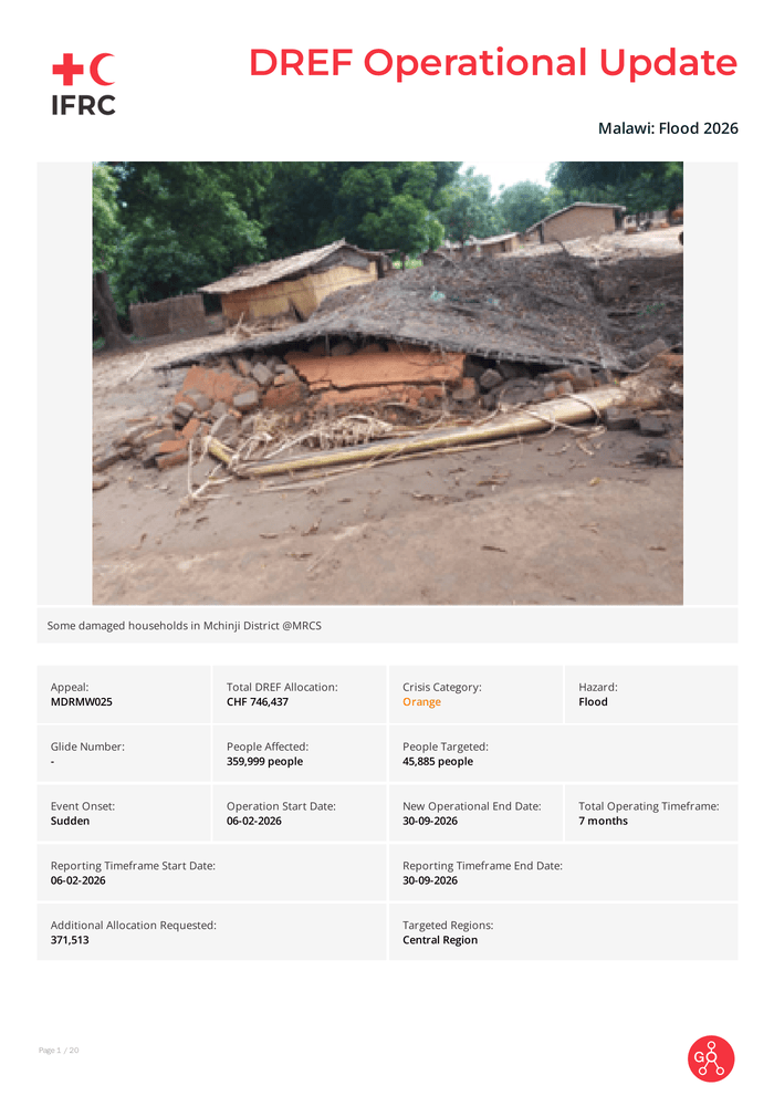 Country: Malawi Source: International Federation of Red Cross and Red Crescent Societies Please refer to the attached file. Description of the Event Date of event 27-03-2026 What happened, where and when? In early January, Nkhotakota District experienced its first wave of devastating floods, triggered by heavy rainfall exceeding 285 mm in a single day. The floods destroyed homes, farmland, and infrastructure, leaving communities vulnerable and struggling to recover. This initial disaster marked the beginning of a prolonged crisis that would intensify in the months ahead. Furthermore on 5–6 January 2026, the Department of Climate Change and Meteorological Services (DCCMS) issued forecasts warning of extreme rainfall across several districts. These alerts reached thresholds that triggered preparedness measures, including the activation of the Malawi Red Cross Society’s Simplified Early Action Protocol (sEAP) in Salima District. While Salima was prioritized for anticipatory action, Nkhotakota remained highly exposed and at risk. On 20 January 2026, Nkhotakota was struck by a second, more severe wave of flooding. This compounded the destruction from December, hitting communities that had not yet recovered. The floods displaced 2, 132 households (10, 912 people) into 14 camps, caused 12 deaths, 39 injuries, and 2 missing persons, and inflicted widespread damage on homes, schools, health facilities, WASH systems, and crops. The scale of destruction created urgent humanitarian needs and highlighted the district’s chronic vulnerability. By 21 January 2026, government assessments confirmed the extensive damage in Nkhotakota. Recognizing the severity of the situation, the Government of Malawi formally addressed a request for support to the Malawi Red Cross Society (MRCS) on 4 February 2026. This appeal aimed to ensure the rapid scale-up of life-saving assistance to affected households. In February 2026, the MRCS launched a Disaster Relief Emergency Fund (DREF) Response in Nkhotakota. Through this intervention, 1, 425 households received cash distributions of MK90, 000 each, helping families meet immediate needs and begin restoring livelihoods. While impactful, the response was limited compared to the scale of displacement and destruction, leaving significant gaps in humanitarian coverage. On 15th March, the Department of Climate Change and Meteorological Services issued a Heavy Rainfall Warning Update on 15 March 2026, valid from 16 to 18 March 2026, noting that a low-pressure system would bring heavy rainfall across lakeshore areas and the southern region. This forecast materialized, resulting in continuous rainfall during the stated period, which led to localized flash flooding in saturated, low-lying areas. Districts most affected included Nkhotakota, Salima, Blantyre, Thyolo, Chiradzulu, and Mulanje, with additional flooding risk in Chikwawa and Nsanje due to runoff from highlands. Rainfall exceeded 100mm in some areas, intensifying flood potential. Residents were advised to avoid crossing flooded rivers, stay clear of low-lying zones, and remain cautious during thunderstorms, particularly in landslide-prone districts of the Southern Highlands. From this advisory, more districts were affected than those which were mentioned in the warning by DCCMS. Between 15 and 18 March 2026, Malawi started reporting nationwide flooding, affecting 23 councils, including Balaka, Blantyre, Chikwawa, Dedza, Machinga, Mangochi, Salima, Zomba, and others. In total, 69, 088 households (310, 896 people) were affected, with 6, 155 households displaced into 84 camps. The floods caused 34 deaths and 197 injuries in Mangochi, Machinga, with figures expected to rise as assessments continued in inaccessible areas. This nationwide disaster compounded earlier impacts in Nkhotakota and other districts, stretching response capacity across the country. This inter-agency assessment affirmed these figures On 25 March 2026, the Department of Disaster Management Affairs (DoDMA) issued an official update confirming the scale of impact across the affected councils. The department appealed for US$10 million (≈K17 billion) to meet immediate humanitarian needs, restore basic services, and initiate early recovery. This marked the latest step in mobilizing coordinated humanitarian response and resource mobilization.