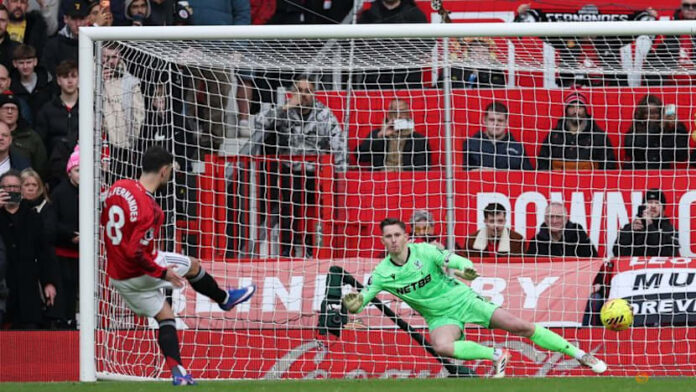 MANCHESTER, England, March 1 : Manchester United captain Bruno Fernandes scored a penalty before delivering a freekick that Benjamin Sesko nodded home for a 2-1 comeback win over 10-man Crystal Palace that moved the hosts into third in the Premier League standings on Sunday.Interim boss Michael Carrick’s unbe